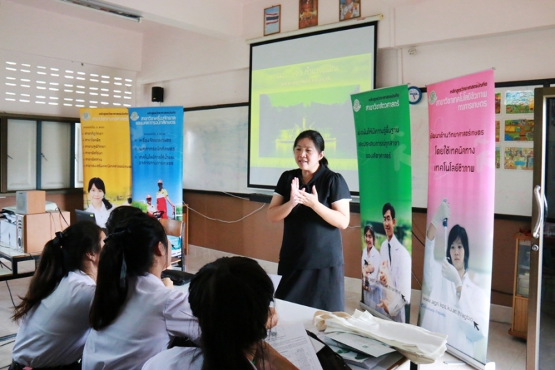 วันที่ 8 พฤศจิกายน 2559 อาจารย์ ดร. นภาพร พันธุ์กมลศิลป์ ประธานหลักสูตรเกษตรศาสตร์ พร้อมด้วยเจ้าหน้าที่งานบริการการศึกษา ได้ไปแนะนำหลักสูตรและการเข้าศึกษาต่อในระดับปริญญาตรี ให้แก่นักเรียนระดับชั้นมัธยมศึกษาตอนปลาย ณ โรงเรียนพระแท่นดงรังวิทยาคาร จ.กาญจนบุรี เพื่อเป็นแนวทางในการเลือกศึกษาต่อที่คณะเกษตร กำแพงแสน มหาวิทยาลัยเกษตรศาสตร์ วิทยาเขตกำแพงแสน ภายใต้โครงการประชาสัมพันธ์หลักสูตรเชิงรุก