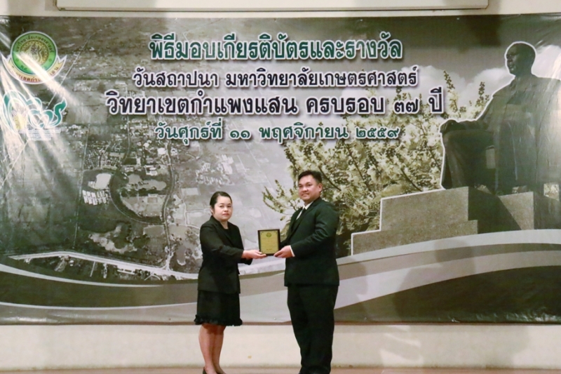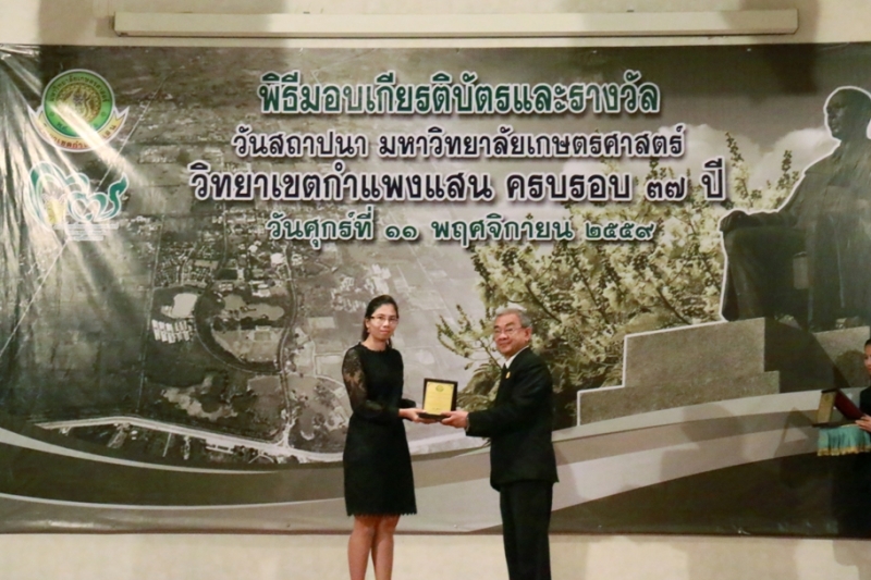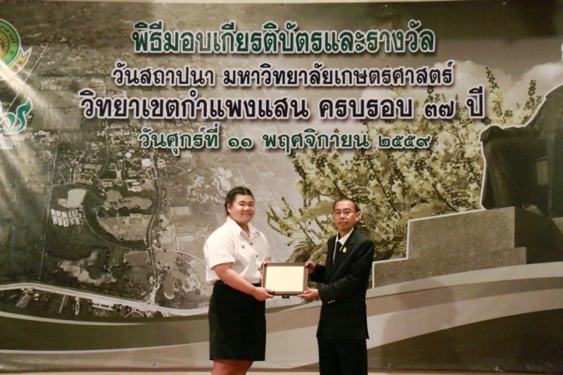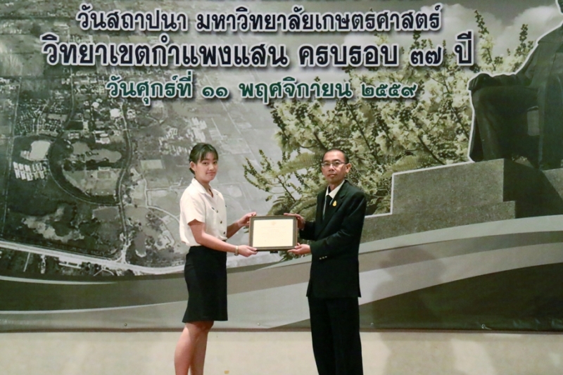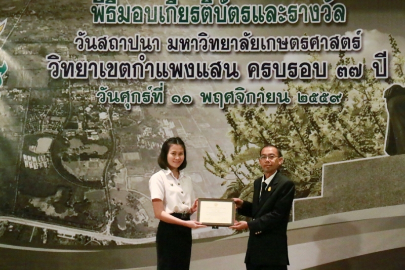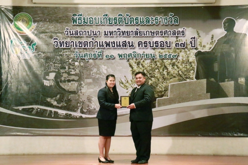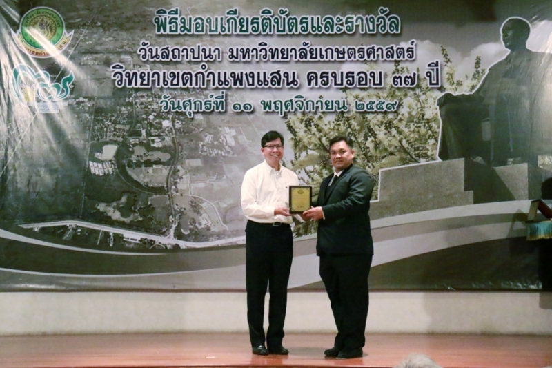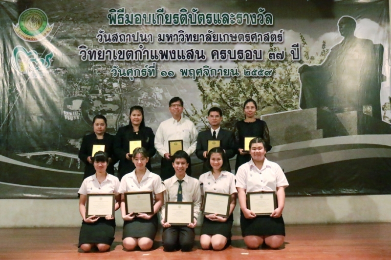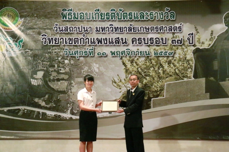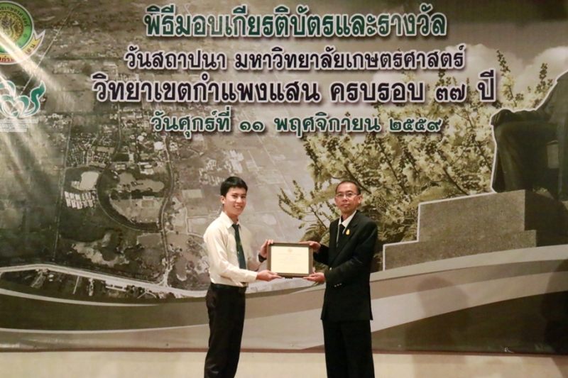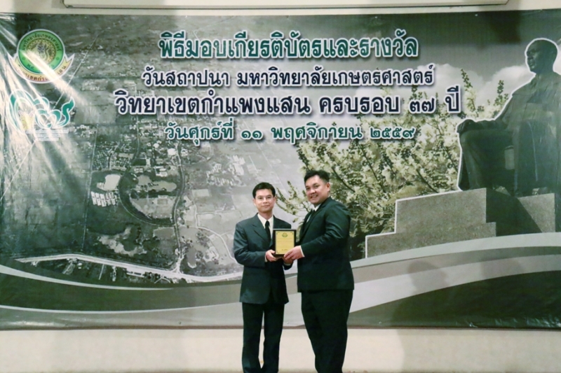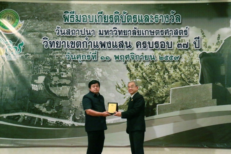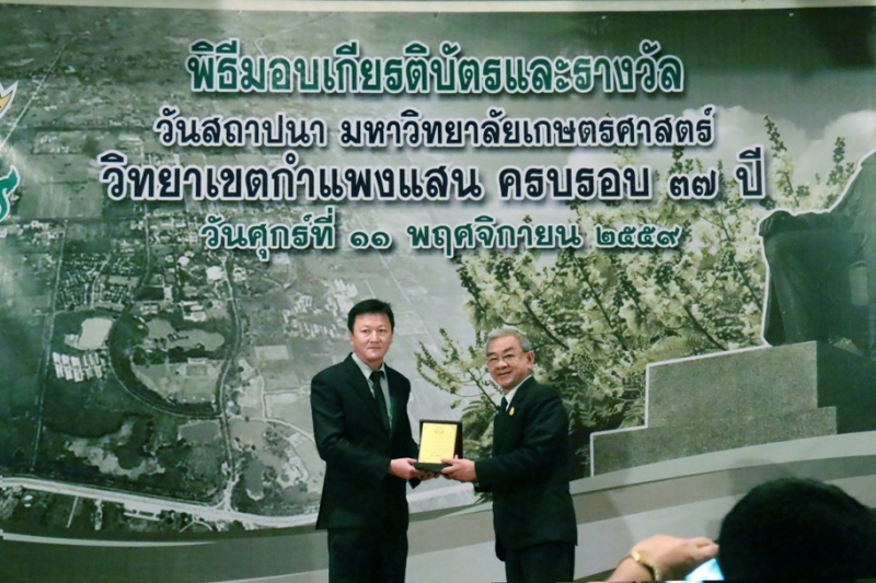 วันที่ 11 พฤศจิกายน 2559 คณะเกษตร กำแพงแสน ร่วมงานวันคล้ายวันสถาปนา ครบรอบ 37 ปี วิทยาเขตกำแพงแสน โดยร่วมพิธีสักการะพระพิรุณทรงนาค ตักบาตรพระสงค์ 38 รูป และพิธีวางพวงมาลาหน้าอนุสาวรีย์หม่อมหลวงชูชาติ กำภู ผู้ก่อตั้งมหาวิทยาลัยเกษตรศาสตร์ วิทยาเขตกำแพงแสน เพื่อระลึกถึงคุณงามความดีของบูรพาจารย์ผู้ก่อตั้งวิทยาเขตกำแพงแสน อีกทั้งเป็นการเฉลิมฉลองในวาระที่วิทยาเขตฯ เปิดการเรียนการสอนครบรอบ 37 ปี จากนั้น เป็นพิธีเปิดนิทรรศการ ศาสตร์ของแผ่นดิน ณ ห้องคอนแวนชั่น อาคารศูนย์มหาวิทยาลัย และพิธีมอบโล่ผู้ให้การสนับสนุนมหาวิทยาลัยฯ พิธีมอบโล่ให้แก่ศิษย์เก่าดีเด่น มอบเกียรติบัตรแก่บุคลากร และนิสิตดีเด่น ประจำปี 2559 ณ ห้องเธียเตอร์ อาคารศูนย์มหาวิทยาลัย