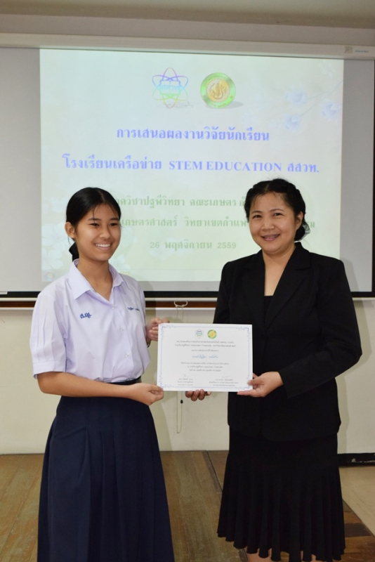 วันที่ 26 พฤศจิกายน 2559 ภาควิชาปฐพีวิทยา คณะเกษตร กำแพงแสน ร่วมกับ สถาบันส่งเสริมการสอนวิทยาศาสตร์และเทคโนโลยี (สสวท.) จัดเวทีการนำเสนอผลงานวิจัยวิทยาศาสตร์ทางดินในรูปแบบ STEM EDUCATION ของโรงเรียนเครือข่าย มหาวิทยาลัยเกษตรศาสตร์ วิทยาเขตกำแพงแสน โดยมีงานวิจัยนำเสนอทั้งสิน 6 เรื่อง ครู 6 คน นักเรียนระดับมัธยมศึกษา 18 คน และนักวิทยาศาสตร์ที่ปรึกษาจากภาควิชาปฐพีวิทยาจำนวน 6 คน ณ ภาควิชาปฐพีวิทยา คณะเกษตร กำแพงแสน