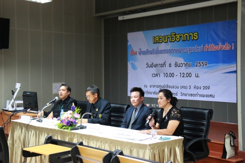 วันที่ 6 ธันวาคม 2559 ภาควิชาสัตวบาล คณะเกษตร กำแพงแสน จัดการเสวนาโคนม เรื่อง "น้ำนมโคพรีเมี่ยมเกรดมาตรฐานใหม่...ทำได้อย่างไร" ให้แก่เกษตรกร และผู้ที่สนใจเข้ารับฟังจำนวนกว่า 145 คน โดย ผศ.ดร.สิรินทร์พร สินธุวณิช หัวหน้าภาควิชาสัตวบาล กำแพงแสน กล่าวเปิดการเสวนา ณ อาคารศูนย์เรียนรวม 3 ห้อง 209 มหาวิทยาลัยเกษตรศาสตร์ วิทยาเขตกำแพงแสน ในงานเกษตรกำแพงแสน ประจำปี 2559