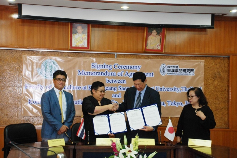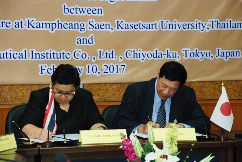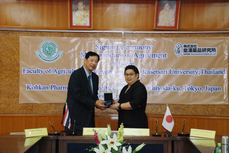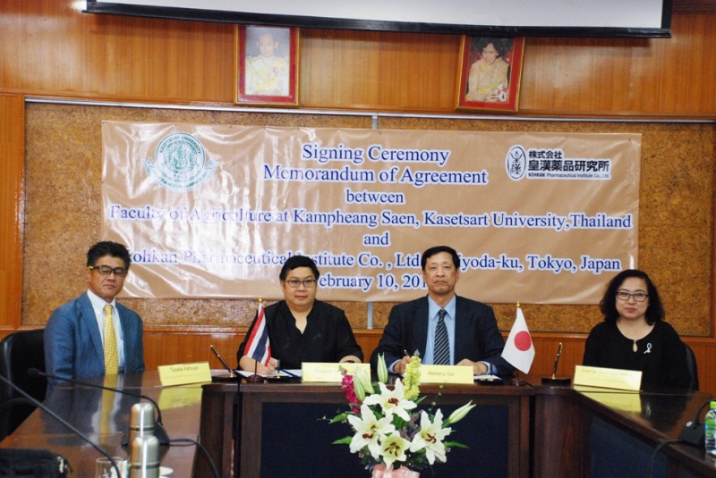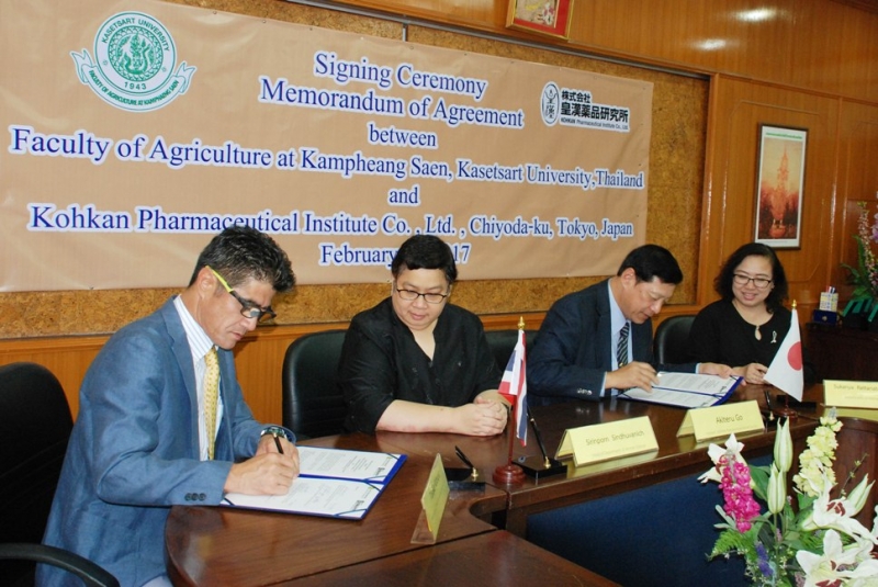 ในวันที่ 10 กุมภาพันธ์ 2560 จึงได้มีการจัดพิธีลงนามข้อตกลง เรื่อง การผลิตและการพัฒนาทางด้านการตลาดสำหรับผลิตภัณฑ์พืชสมุนไพร ระหว่าง ภาควิชาสัตวบาล คณะเกษตร กำแพงแสน ร่วมกับ บริษัท โคคัน ฟาร์มาซูติคอล อินสติติวท์ จำกัด เพื่อนำสมุนไพรกวาวเครือขาว sardi 190 และหมามุ่ยอินเดีย สำหรับผลิตเป็นอาหารเสริมสุขภาพ และเครื่องสำอางของประเทศญี่ปุ่นภายใต้ชื่อ บริษัท โคคัน ฟาร์มาซูติคอล อินสติติวท์ จำกัด โดย ผศ.ดร.สิรินทร์พร สินธุวณิชย์ หัวหน้าภาควิชาสัตวบาล คณะเกษตร กำแพงแสน ได้กล่าวถึงความเป็นมาและกล่าวต้อนรับทุกท่าน จากนั้นเริ่มพิธีลงนามข้อตกลง โดย ผศ.ดร.สิรินทร์พร สินธุวณิชย์ หัวหน้าภาควิชาสัตวบาล คณะเกษตร กำแพงแสน และ ผศ.ดร.สุกัญญา รัตนทับทิมทอง ร่วมกับ Mr. Amiteru Go, President และ Mr.Tasaka Katsuya, General Director จาก บริษัท โคคัน ฟาร์มาซูติคอล อินสติติวท์ จำกัด โดยมีเจ้าหน้าที่ของทั้ง 2 ฝ่ายร่วมเป็นสักขีพยาน ณ ห้องเสรี-สมพร ทรัพยสาร คณะเกษตร กำแพงแสน มหาวิทยาลัยเกษตรศาสตร์ วิทยาเขตกำแพงแสน จังหวัดนครปฐม