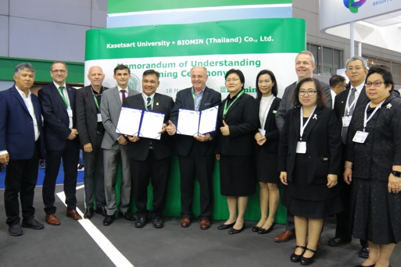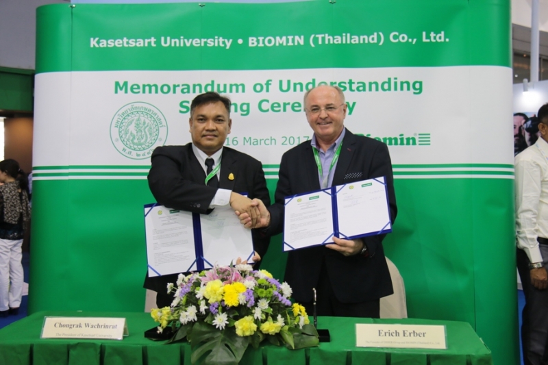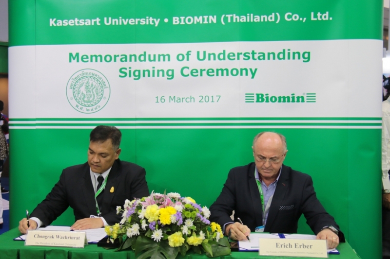 วันที่ 16 มีนาคม 2560 มีพิธีลงนามความร่วมมือระหว่าง มหาวิทยาลัยเกษตรศาสตร์ คณะเกษตร กำแพงแสน กับ บริษัท ไบโอมิน (ประเทศไทย) จำกัด เพื่อสร้างความร่วมมือด้านงานวิจัยที่เกี่ยวกับการประยุกต์ใช้เทคโนโลยีและนวัตกรรมด้านโภชนาการสัตว์และสุขภาพสัตว์ โดย ดร.จงรัก วัชรินทร์รัตน์ รักษาการแทนอธิการบดีมหาวิทยาลัยเกษตรศาสตร์ และ Mr.Erich Erber ประธานกรรมการ บริษัท ไบโอมิน (ประเทศไทย) จำกัด โดยมีผู้บริหารและเจ้าหน้าที่ทั้ง 2 ฝ่าย รวมทั้งผู้เข้าชมงาน ร่วมเป็นสักขีพยาน ณ บูธ บริษัท ไบโอมิน (ประเทศไทย) จำกัด ในงาน VIV Asia ศูนย์ประชุมไบเทค บางนา