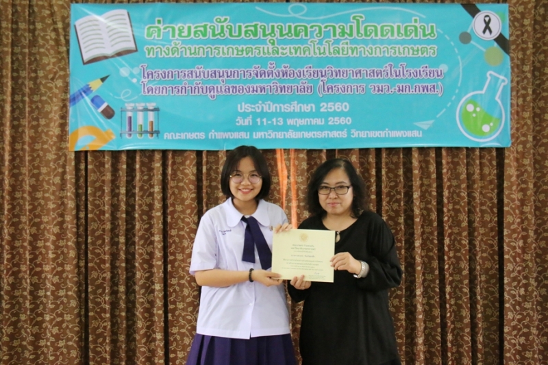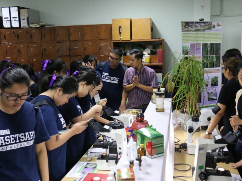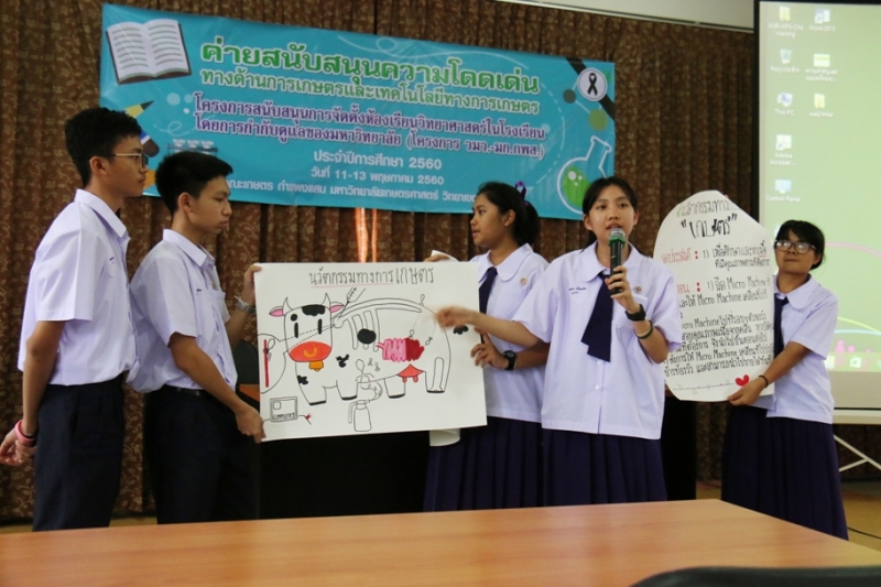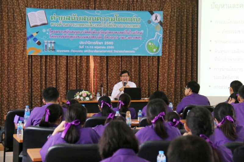 คณะเกษตร กำแพงแสน จัดกิจกรรมให้กับค่ายสนับสนุนความโดดเด่นทางการเกษตรและเทคโนโลยีทางการเกษตร ภายใต้โครงการสนับสนุนการจัดตั้งห้องเรียนวิทยาศาสตร์ในโรงเรียนโดยการกำกับดูแลของมหาวิทยาลัย (วมว.) เพื่อสนับสนุนความโดดเด่นทางด้านวิทยาศาสตร์และเทคโนโลยีทางการเกษตร ให้เห็นถึงความสำคัญของการศึกษาในสาขาการเกษตร และเปิดมุมมองใหม่เกี่ยวกับสาขาการเกษตร ให้แก่นักเรียนที่เข้าร่วมโครงการซึ่งเป็นนักเรียนในระดับชั้นมัธยมศึกษาปีที่ 4 จากโรงเรียนสาธิตแห่งมหาวิทยาลัยเกษตรศาสตร์ วิทยาเขตกำแพงแสน จำนวน 60 คน ในระหว่างวันที่ 11-13 พฤษภาคม 2560 โดย ผศ.ดร.สุกัญญา รัตนทับทิมทอง รักษาการแทนรองคณบดีฝ่ายวิเทศสัมพันธ์ กล่าวเปิดโครงการ ณ ห้องเอนกประสงค์ คณะเกษตร กำแพงแสน