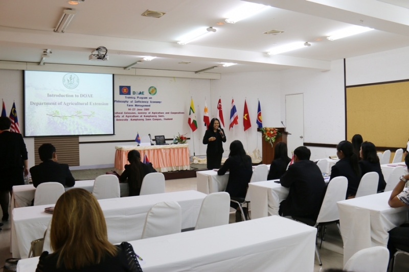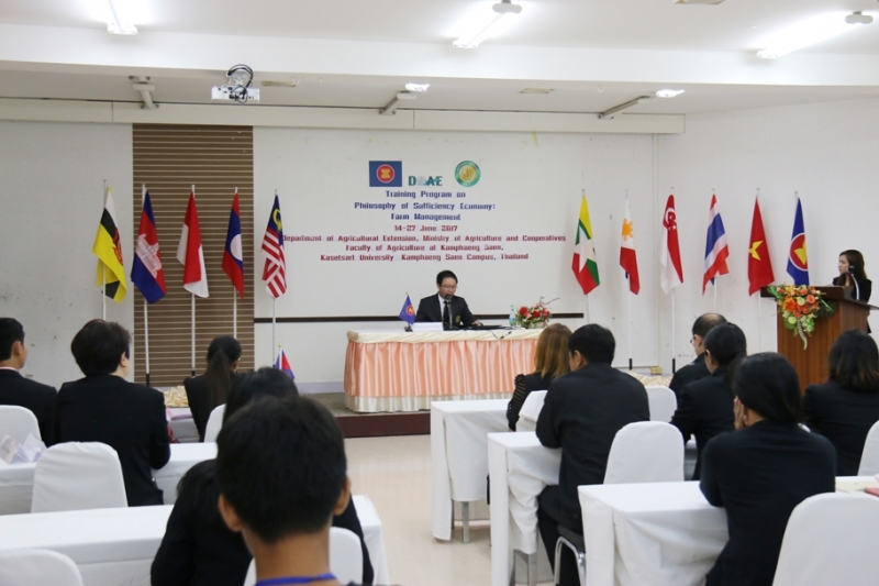 โครงการฝึกอบรมการจัดการฟาร์มตามแนวปรัชญาเศรษฐกิจพอเพียง นั้น อยู่ภายใต้ความร่วมมือของมหาวิทยาลัยเกษตรศาสตร์ วิทยาเขตกำแพงแสน กับ กรมส่งเสริมการเกษตร นำเดินการโดย ภาควิชาส่งเสริมและนิเทศศาสตร์เกษตร คณะเกษตร กำแพงแสน และ สำนักงานส่งเสริมและพัฒนาการเกษตรที่ 2 จังหวัดราชบุรี จัดโครงการฝึกอบรมการจัดการฟาร์มตามแนวปรัชญาเศรษฐกิจพอเพียง (Training Program on Philosophy of Sufficiency Economy : Farm Management) ระหว่างวันที่ 14-27 มิถุนายน 2560 ณ มหาวิทยาลัยเกษตรศาสตร์ วิทยาเขตกำแพงแสน จังหวัดนครปฐม ให้แก่เยาวชนจากประเทศอาเซียน ได้แก่ สาธารณรัฐประชาธิปไตยประชาชนลาว กัมพูชา เวียดนาม เมียนมา อินโดนีเซีย สิงคโปร์ ฟิลิปปินส์ บรูไน มาเลเซีย และประเทศไทย รวมเจ้าหน้าที่ผู้รับผิดชอบจากส่วนกลาง สำนักงานส่งเสริมและพัฒนาการเกษตรที่ 2 จังหวัดราชบุรี และศูนย์ส่งเสริมเยาวชนเกษตรอาเซียน จังหวัดกาญจนบุรี รวมทั้งสิ้น 26 ราย เพื่อให้เยาวชนเกษตรอาเซียนได้รับความรู้ละทักษะทางการเกษตรตามแนวปรัชญาเศรษฐกิจพอเพียง และสามารถนำไปประยุกต์ใช้และเผยแพร่ความรู้และทักษะให้กับเยาวชนและเกษตรกรในประเทศของตนได้