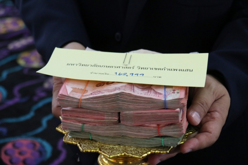 วันที่ 2 พฤศจิกายน 2560 ผู้บริหาร บุคลากร และนิสิต คณะเกษตร กำแพงแสน ร่วมงานทอดกฐินสามัคคี มหาวิทยาลัยเกษตรศาสตร์ วิทยาเขตกำแพงแสน ประจำปี 2560 ณ วัดห้วยม่วง ตำบลห้วยม่วง อำเภอกำแพงแสน จังหวัดนครปฐม โดยมียอดทำบุญทั้งหมด 162,999 บาท