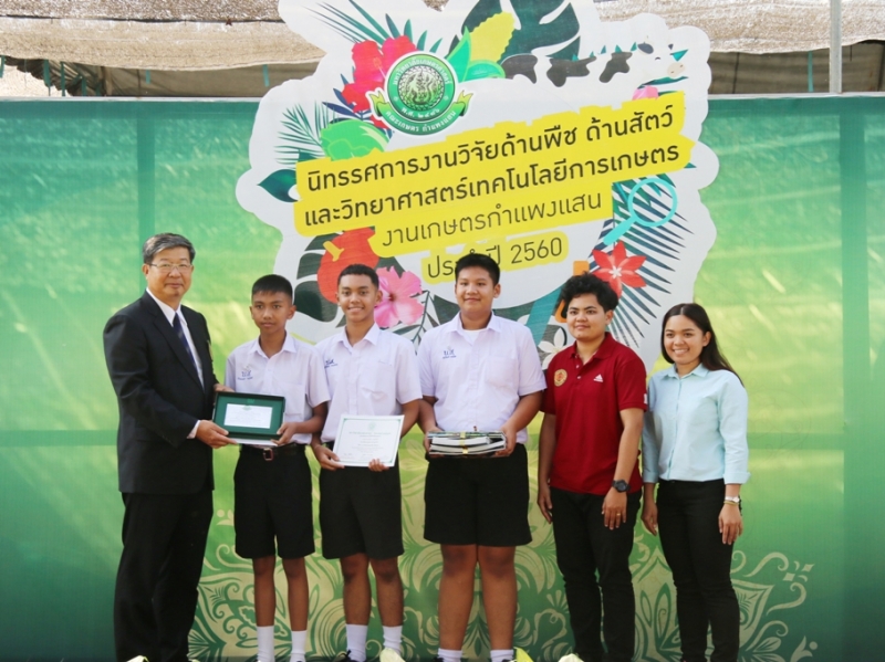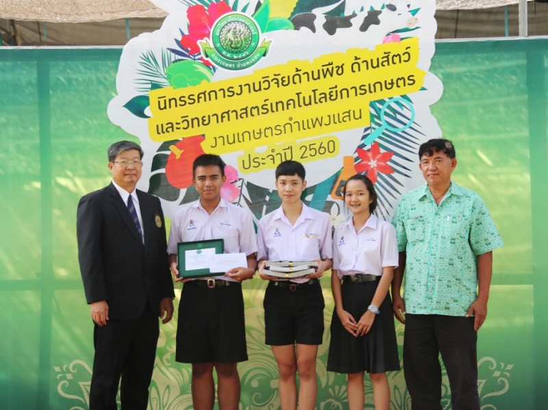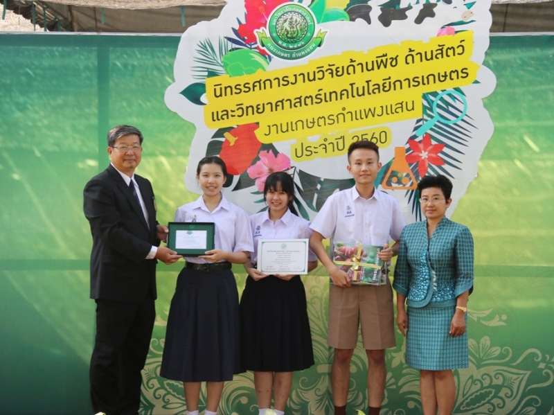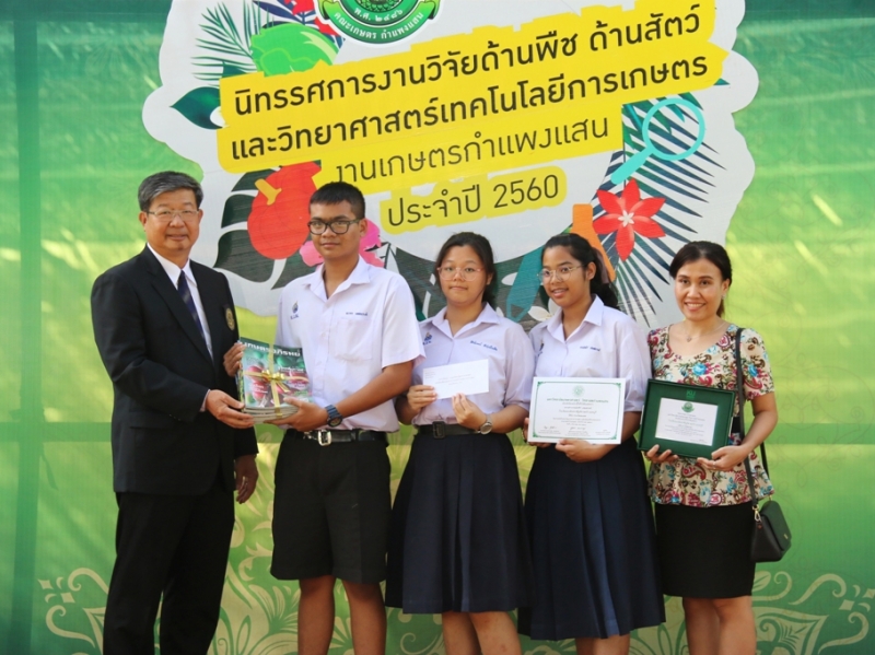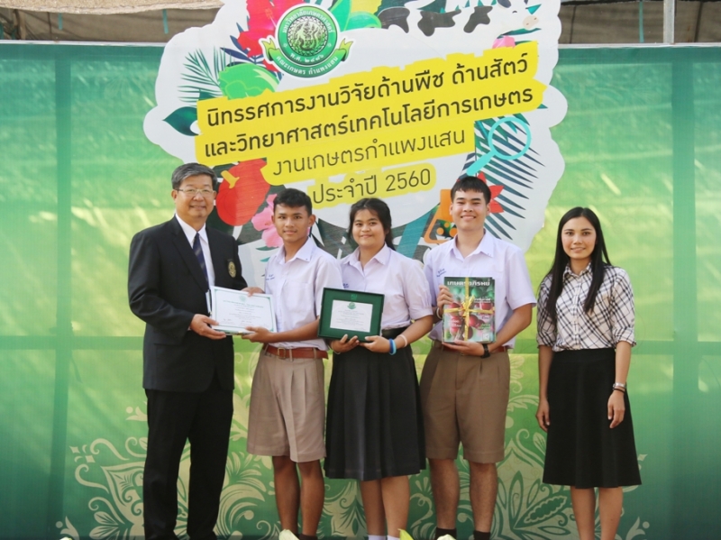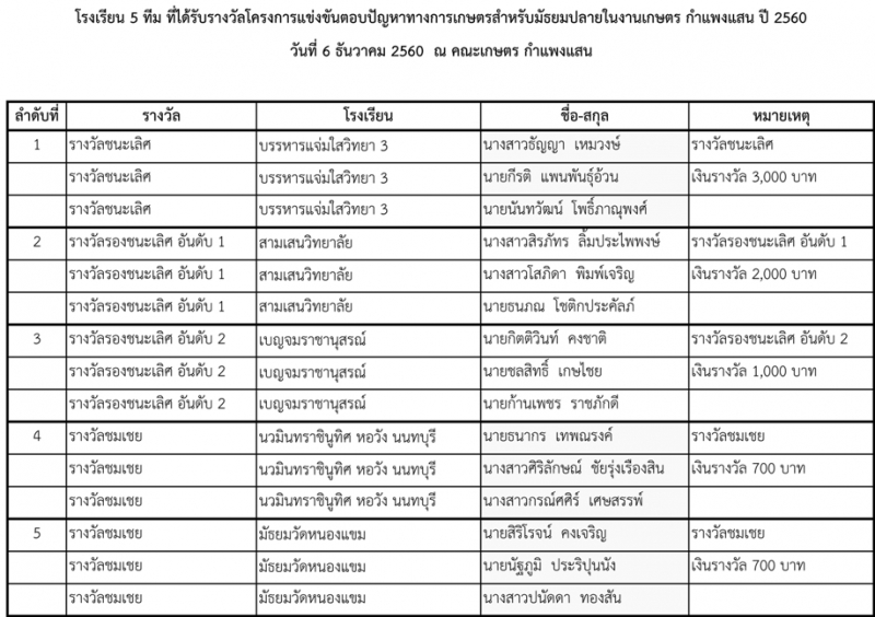 วันที่ 6 ธันวาคม 2560 คณะเกษตร กำแพงแสน จัดการแข่งขันตอบปัญหาทางการเกษตร สำหรับนักเรียนระดับชั้นมัธยมศึกษาตอนปลาย ในหัวข้อ เกษตรไทย ก้าวไกล Thailand 4.0 ณ คณะเกษตร กำแพงแสน ในงานเกษตรกำแพงแสน มีโรงเรียนที่ส่งนักเรียนเข้าร่วมการแข่งขันจำนวน 30 โรงเรียน ผ่านเข้าสู่รอบชิงชนะเลิศ จำนวน 5 โรงเรียน โดยมีอาจารย์ของคณะเกษตร กำแพงแสน จำนวน 6 ท่าน เป็นคณะกรรมการให้ความรู้เพิ่มเติมในคำถามแต่ละข้อ เมื่อเสร็จสิ้นการแข่งขัน รศ.ดร. ปภพ สินชยกุล คณบดีคณะเกษตร กำแพงแสน ให้เกียรติมอบโล่รางวัล ประกาศนียบัตร และทุนการศึกษา แก่โรงเรียนที่ชนะการแข่งขัน ผลการแข่งขันมีดังนี้