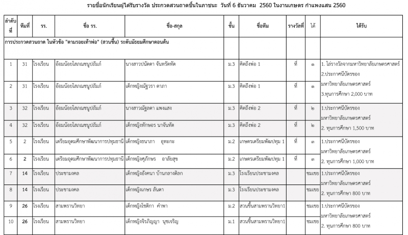 รางวัลชมเชย คือ โรงเรียนประชามงคล (ทีมโรงเรียนประชามงคล) และ โรงเรียนสามพรานวิทยา (ทีมสวนชื้นสามพรานวิทยา 1)