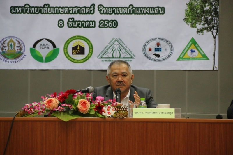 วันที่ 8 ธันวาคม 2560 คณะเกษตร กำแพงแสน ดำเนินการเสวนาวิชาการ สาขาพืชและเทคโนโลยีชีวภาพ เรื่อง ขับเคลื่อนเกษตรไทยด้วยนวัตกรรมและเทคโนโลยี ในการสัมมนาและประชุมวิชาการระดับชาติ ครั้งที่ 14 โดยวิทยากรผู้ทรงคุณวุฒิ 2 ท่าน ได้แก่ รศ.ดร.พงศ์เทพ อัครธนกุล ผู้อำนวยการศูนย์เทคโนโลยีชีวภาพเกษตร มหาวิทยาลัยเกษตรศาสตร และ รศ.ดร.มนต์ชัย ดวงจินดา คณบดีคณะเกษตรศาสตร์ มหาวิทยาลัยขอนแก่น และประธานสภาคณบดีสาขาเกษตรแห่งประเทศไทย ดำเนินรายการโดย ดร.ปรเมษฐ์ ชุ่มยิ้ม ชื่อหน่วยงาน สำนักงานคณะกรรมการนโยบายวิทยาศาสตร์ เทคโนโลยีและนวัตกรรมแห่งชาติ (สวทน.) มีนิสิต เกษตรกร และผู้สนใจเข้าร่วมฟังการเสวนาจำนวนมาก ณ ศูนย์เรียนรวม 3 ห้อง 303 มหาวิทยาลัยเกษตรศาสตร์ วิทยาเขตกำแพงแสน