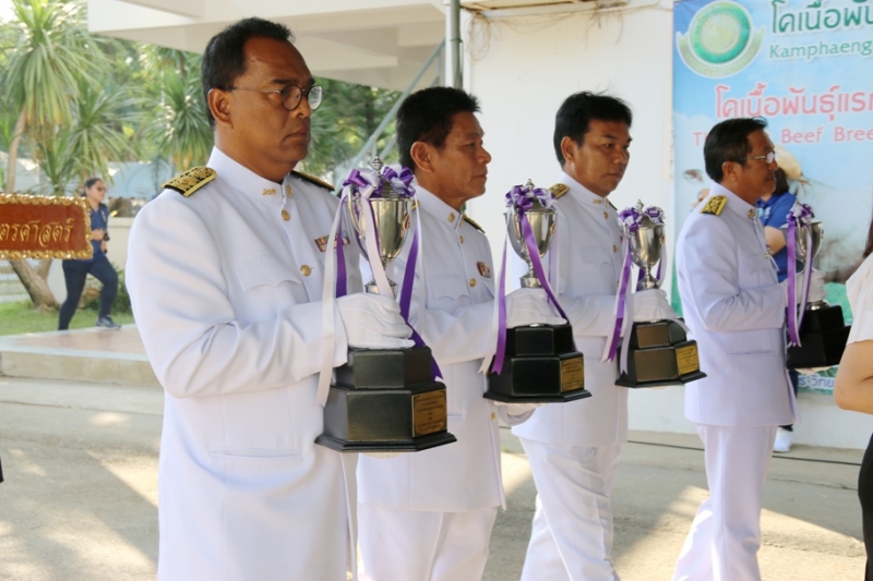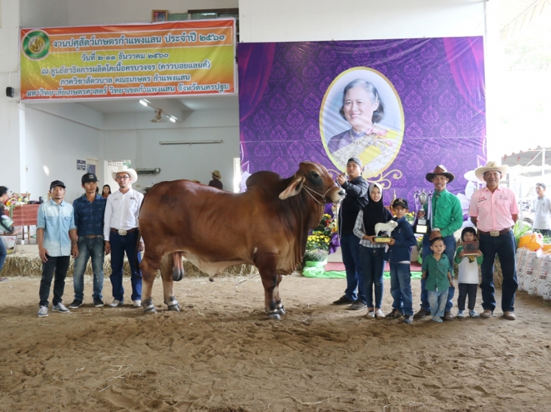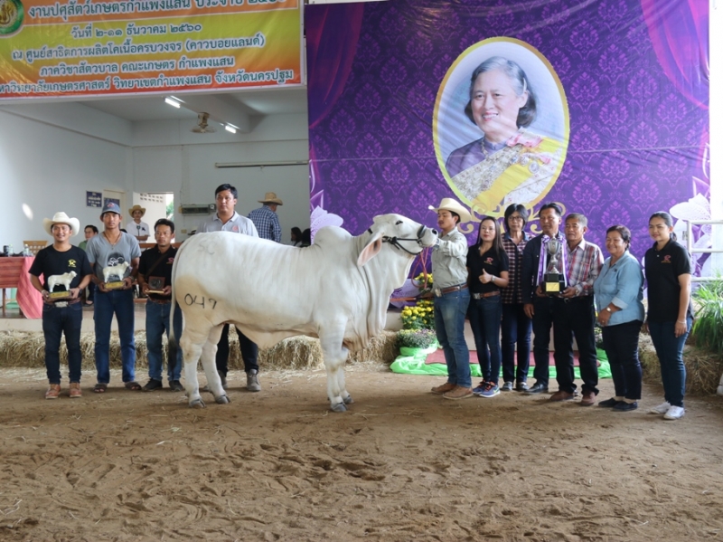 ในวันที่ 9 ธันวาคม 2560 รศ.ดร.ตฤณ แสงสุวรรณ รักษาการแทนรองอธิการบดีวิทยาเขตกำแพงแสน เป็นประธานในพิธีอัญเชิญถ้วยพระราชทาน สมเด็จพระเทพรัตนราชสุดาฯ สยามบรมราชกุมารี เปิดกรวยดอกไม้ กล่าวสำนึกในพระมหากรุณาธิคุณ และกล่าวเปิดงาน โดย ผศ.ดร.สิรินทร์พร สินธุวณิชย์ หัวหน้าภาควิชาสัตวบาล คณะเกษตร กำแพงแสน กล่าวรายงานการจัดการประกวดโคเนื้อในระบบสากล และมอบของที่ระลึกให้แก่ทีมคณะกรรมการ ได้รับเกียรติจาก Mr. John Croaker จากสมาคมผู้เลี้ยงวัวอเมริกันบราห์มัน ประเทศ เป็นกรรมการผู้ตัดสินการประกวดโคเนื้อพันธุ์บราห์มันพันธุ์แท้ และ คุณเมธา ซัคเซ็ด ผู้เชี่ยวชาญด้านโคเนื้อพันธุ์กำแพงแสน เป็นกรรมการผู้ตัดสินการประกวดโคเนื้อพันธุ์กำแพงแสน โดยในปีนี้ มีโคเนื้อพันธุ์บราห์มันพันธุ์แท้(เพศเมียและเพศผู้) เข้าร่วมประกวด จำนวน 93 ตัว จาก 44 ฟาร์ม และโคเนื้อพันธุ์กำแพงแสน(เพศเมียและเพศผู้) จำนวน 53 ตัว จาก 15 ฟาร์ม
