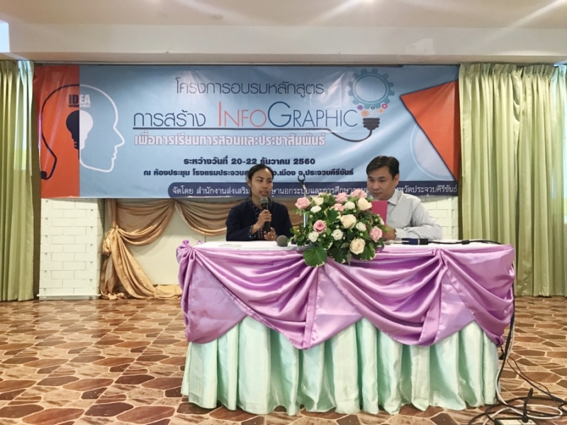 ผู้ช่วยศาสตราจารย์ ดร.เชิดพงษ์ ขีระจิตต์ ภาควิชาส่งเสริมและนิเทศศาสตร์เกษตร ร่วมกับ สำนักงานส่งเสริมการศึกษานอกระบบและการศึกษาตามอัธยาศัย จังหวัดประจวบคีรีขันธ์ ได้จัดโครงการบริการวิชาการแก่สังคม ในหัวข้อเรื่อง การสร้าง InfoGraphic เพื่อการเรียนการสอนและการประชาสัมพันธ์ ให้กับคณะครูอาสา และเจ้าหน้าที่การศึกษานอกโรงเรียน จังหวัดประจวบคีรีขันธ์ จำนวน 34 คน ระหว่างวันที่ 20 22 ธันวาคม 2560 ณ โรงแรมประจวบสามอ่าว จังหวัดประจวบคีรีขันธ์