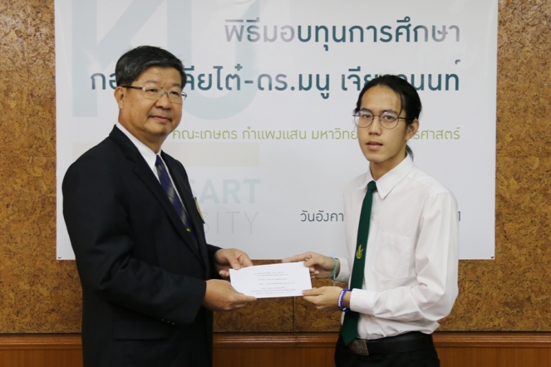 วันที่ 16 มกราคม 2561 รศ.ดร. ปภพ สินชยกุล คณบดีคณะเกษตร กำแพงแสน กล่าวให้โอวาท ชื่นชม แสดงความยินดี และมอบทุนการศึกษาจาก กองทุนเจียไต๋-ดร.มนู เจียรวนนท์ ให้แก่นิสิตที่ได้รับคัดเลือก ณ ห้องเสรี-สมพร ทรัพยสาร (ห้องประชุม 1) คณะเกษตร กำแพงแสน โดยแบ่งเป็น 2 ประเภท คือ 1) ทุนการศึกษาประเภทขาดแคลน 2) ทุนการศึกษาประเภทเรียนดีเด่น และประเภทเรียนดี ประจำปีการศึกษา 2560 เพื่อเป็นการส่งเสริมและสนับสนุนให้นิสิตมีความมุ่งมั่นในการศึกษา คณะกรรมการบริหารกองทุนฯ จึงได้พิจารณาผลการศึกษาของนิสิตตามข้อกำหนดของกองทุนฯ ดังรายชื่อตามประกาศที่แนบมานี้