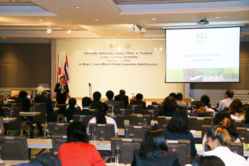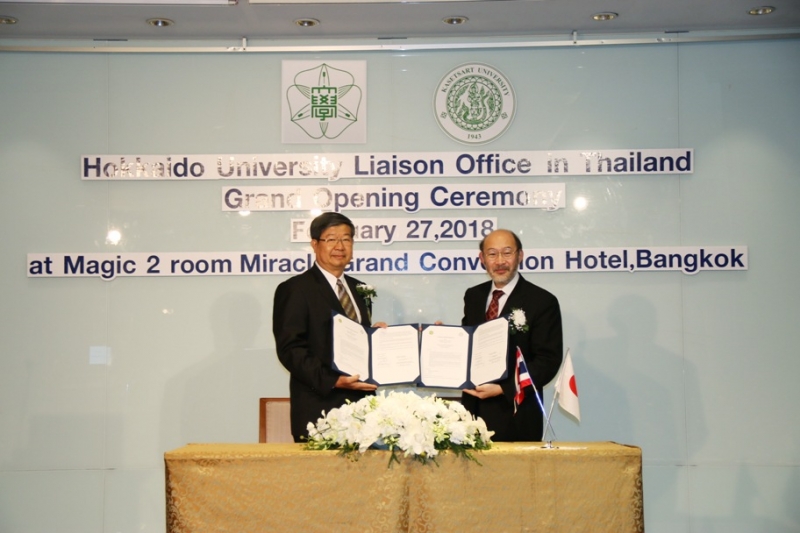 วันที่ 27 กุมภาพันธ์ 2561 เวลา 9.00 - 15.35 น. คณะเกษตร กำแพงแสน มหาวิทยาลัยเกษตรศาสตร์ วิทยาเขตกำแพงแสน ดำเนินการจัดพิธีเปิดศูนย์ประสานงานมหาวิทยาลัยฮอกไกโด ประจำประเทศไทย (Hokkaido University Liaison Office in Thailand) ซึ่งมหาวิทยาลัยเกษตรศาสตร์ ร่วมกับ มหาวิทยาลัยฮอกไกโด ประเทศญี่ปุ่น ดำเนินการจัดตั้งขึ้น เพื่อเป็นศูนย์ประสานงานทางวิชาการ ระหว่างมหาวิทยาลัยฮอกไกโด ประเทศญี่ปุ่น กับสถาบันอุดมศึกษาในประเทศไทย โดยผู้ช่วยศาสตราจารย์ ดร. บัญชา ชิณศรี รักษาการแทนผู้ช่วยอธิการบดี มหาวิทยาลัยเกษตรศาสตร์ ให้เกียรติเป็นประธานกล่าวต้อนรับ รศ.ดร สร้อยสุดา ณ ระนอง ผู้ช่วยอธิการบดีฝ่ายวิชาการ กล่าวแนะนำมหาวิทยาลัยเกษตรศาสตร์ และ Prof. So KAWANOBE, Executive Director, Institute for international Collaboration, Hokkaido University กล่าวเปิดงาน โดยมีตัวแทนจากหลายองค์กรและสถาบันทั้งจากประเทศไทยและประเทศญี่ปุ่นเข้าร่วมงาน และร่วมเป็นสักขีพยานในพิธีลงนามบันทึกข้อตกลง Cotutelle Program ระหว่าง คณะเกษตร กำแพงแสน มหาวิทยาลัยเกษตรศาสตร์ วิทยาเขตกำแพงแสน โดย รศ.ดร. ปภพ สินชยกุล คณบดีคณะเกษตร กำแพงแสน และ Professor Dr. YOKOTA Atsushi. Dean of the Graduate School of Agriculture, Hokkaido University จากนั้นเป็นการมอบของที่ระลึกและถ่ายรูปร่วมกัน ในช่วงบ่าย มีการแนะนำคณะต่างๆ ของมหาวิทยาลัยเกษตรศาสตร์และ Hokkaido University โดยอาจารย์และผู้บริหาร ณ ห้องแมจิก 2 โรงแรมมิราเคิลแกรนด์ คอนแวนชั่น กรุงเทพ