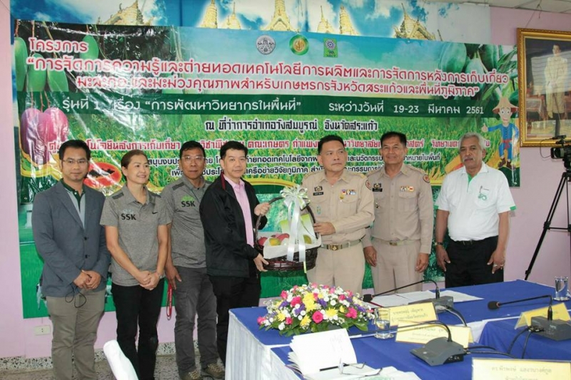 วันที่ 20 มีนาคม 2561 ศูนย์เทคโนโลยีหลังการเก็บเกี่ยว ภาควิชาพืชสวน คณะเกษตรกำแพงแสน ดำเนินการจัดการฝึกอบรมเชิงปฏิบัติการ หลักสูตรที่ 1 เรื่อง การพัฒนาวิทยากรในพื้นที่ ภายใต้โครงการ การจัดการความรู้และถ่ายทอดเทคโนโลยีการผลิตและการจัดการหลังการเก็บเกี่ยวมะละกอ และมะม่วงคุณภาพสำหรับเกษตรกรจังหวัดสระแก้วและพื้นที่ภูมิภาค ได้รับเกียรติจาก นายพรพจน์ เพ็ญพาส ผู้ว่าราชการจังหวัดสระแก้ว และ รศ.ดร. คณพล จุฑามณี รักษาการแทนผู้ช่วยอธิการบดีฝ่ายวิจัย ร่วมเปิดโครงการ โดย ดร.พีรพงษ์ แสงวนางค์กูล หัวหน้าโครงการ กล่าวรายงาน มีคณาจารย์ นักวิจัย และนักวิชาการ จากคณะเกษตร กำแพงแสน ร่วมเป็นวิทยากรบรยยาย โดยโครงการจัดขึ้นระหว่างวันที่ 19-23 มีนาคม 2561 ณ ที่ว่าการอำเภอวังสมบูรณ์ จังหวัดสระแก้ว