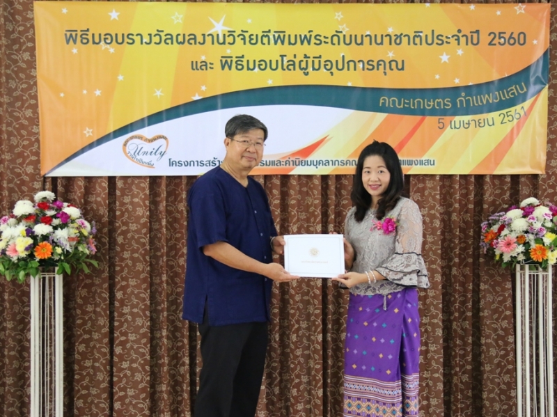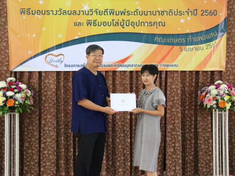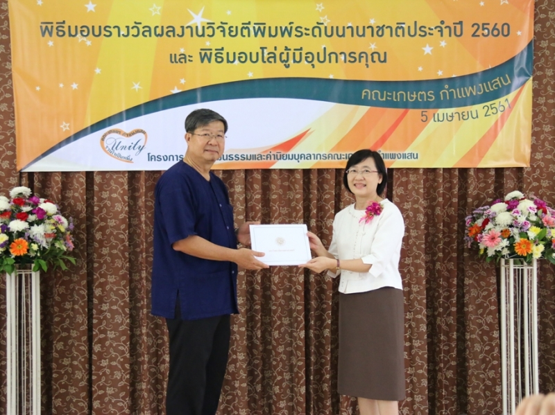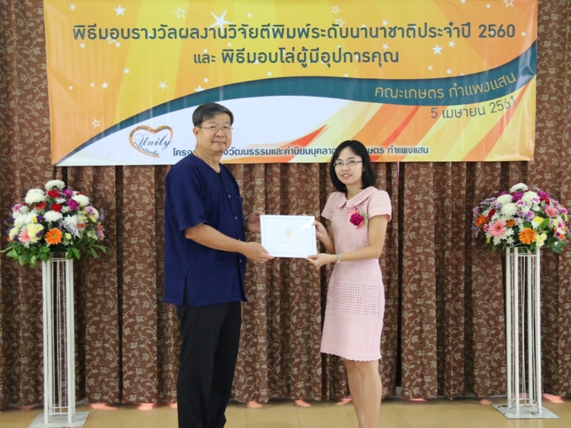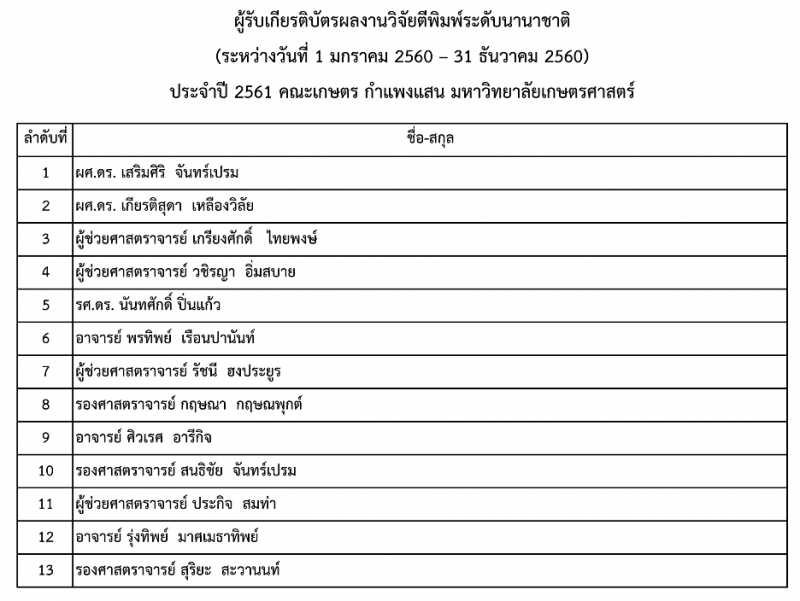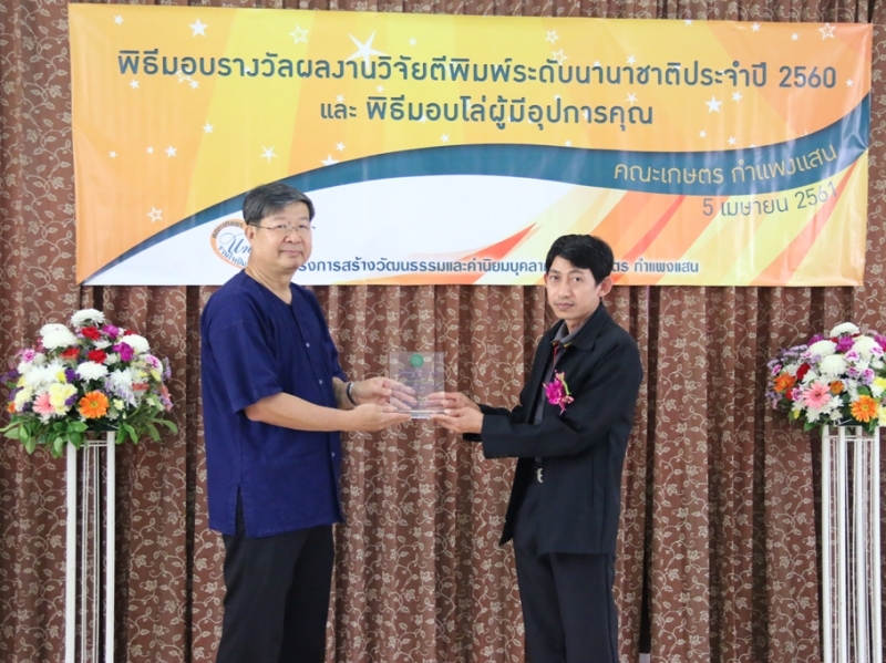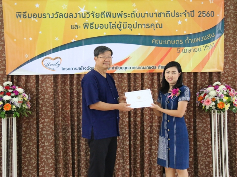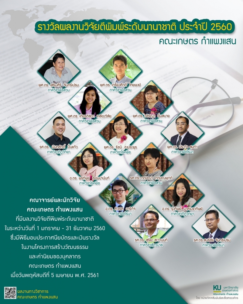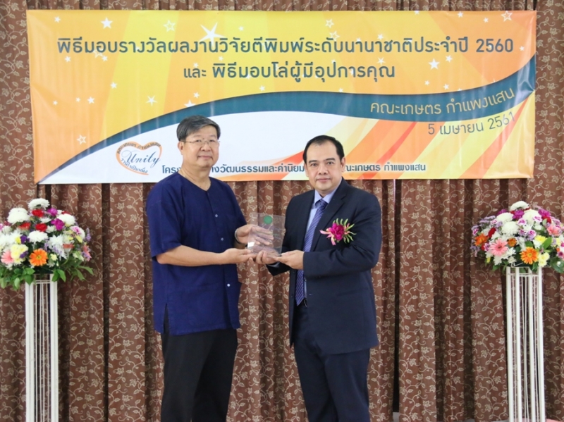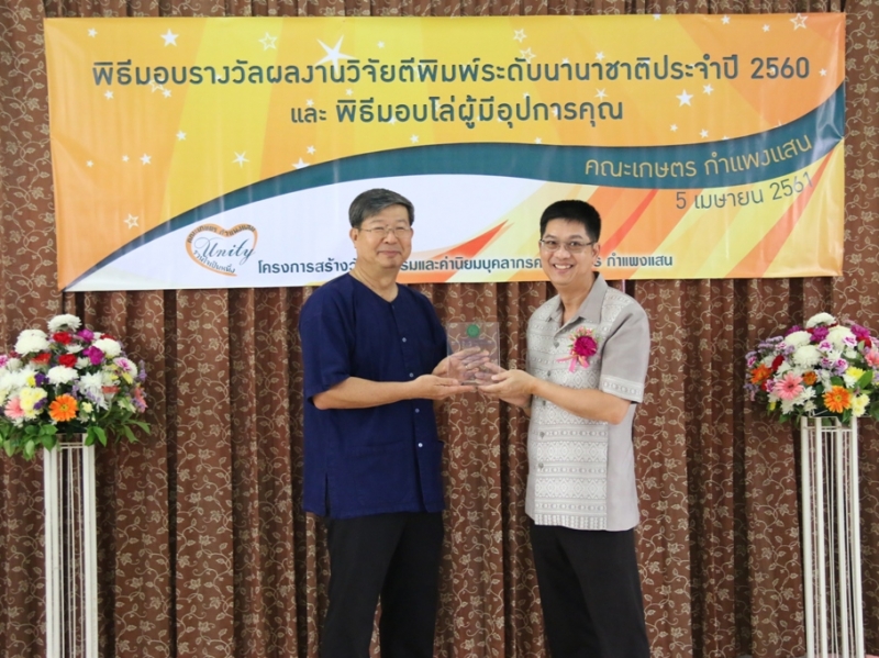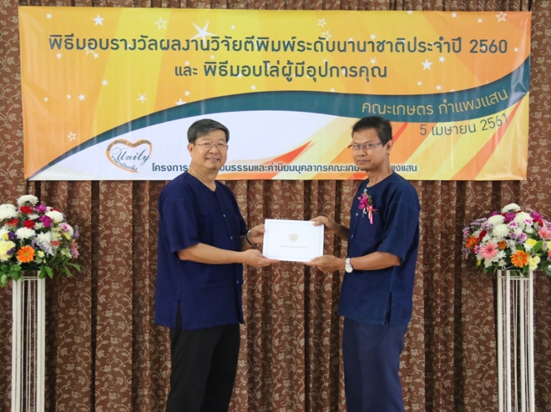 คณะเกษตร กำแพงแสน จัดพิธีมอบรางวัลผลงานวิจัยตีพิมพ์ระดับนานาชาติ ประจำปี 2560 ให้แก่คณาจารย์และนักวิจัย คณะเกษตร กำแพงแสน ที่มีผลงานวิจัยตีพิมพ์ระดับนานาชาติ ในระหว่างวันที่ 1 มกราคม - 31 ธันวาคม 2560 ซึ่งมีพิธีมอบประกาศนียบัตรและเงินรางวัล ในงานโครงการสร้างวัฒนธรรมและค่านิยมของบุคลากร คณะเกษตร กำแพงแสน เมื่อวันพฤหัสบดีที่ 5 เมษายน พ.ศ. 2561 ณ ห้องอเนกประสงค์ คณะเกษตร กำแพงแสน