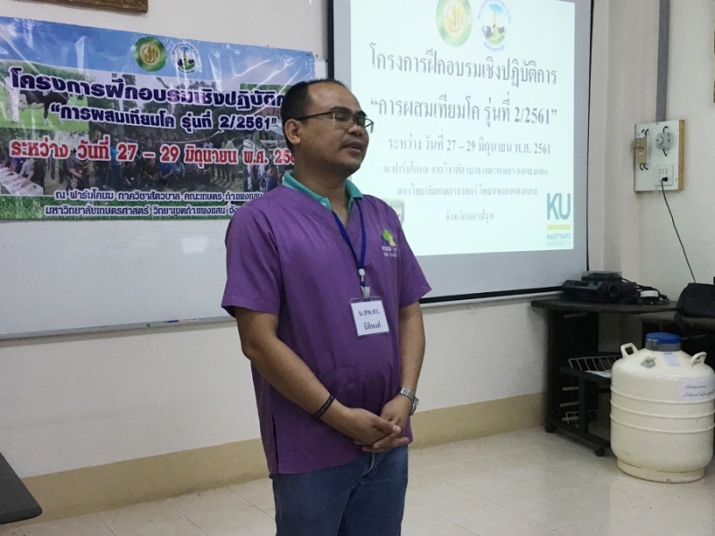 วันที่ 27 29 มิถุนายน พ.ศ. 2561 ฟาร์มโคนม ภาควิชาสัตวบาล คณะเกษตร กำแพงแสน โดย อาจารย์ นายสัตวแพทย์ ดร.นิติพงศ์ หอมวงษ์ จัดโครงการฝึกอบรมเชิงปฏิบัติการ การผสมเทียมโค รุ่นที่ 2 ให้กับกลุ่มเกษตรกรผู้เลี้ยงโคนมในจังหวัดนครปฐม และบุคคลทั่วไป เพื่อเป็นการเพิ่มพูนความรู้ ความเข้าใจ และสามารถนำทักษะ เทคนิคการปฏิบัติการผสมเทียมโคไปใช้ประโยชน์ด้วยตนเองอย่างแท้จริงซึ่งจะเป็นแนวทางในการประกอบอาชีพการเลี้ยงโคนมมากขึ้น ณ ฟาร์มโคนม ภาควิชาสัตวบาล คณะเกษตร กำแพงแสน
