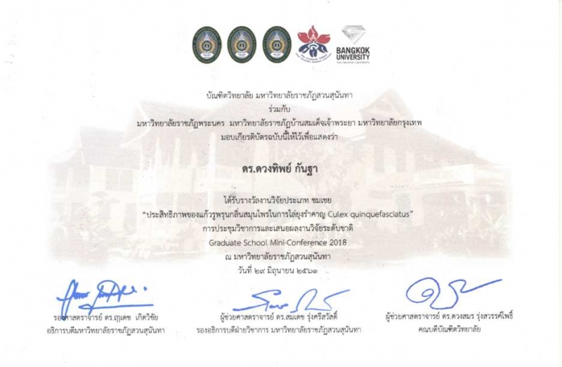 ดร. ดวงทิพย์ กันฐา นักวิชาการเกษตร ภาควิชากีฏวิทยา คณะเกษตร กำแพงแสน เข้ารับรางวัล นักวิจัยรางวัลงานวิจัยประเภท ชมเชย ในผลงาน ประสิทธิภาพของแก้วรูพรุนกลิ่นสมุนไพรในการไล่ยุงรำคาญ Culex quinquefasciatus (โดยมี อาจารย์ ดร. รุ่งทิพย์ มาศเมธาทิพย์ ผู้ร่วมในโครงการวิจัย) จาก ผศ.ดร. ดวงสมร รุ่งสวรรค์โพธิ์ คณบดีบัณฑิตวิทยาลัย มหาวิทยาลัยราชภัฏสวนสุนันทา ในการประชุมวิชาการและเสนอผลงานวิจัยระดับชาติ Graduate School Mini-Conference 2018 โดย ในวันที่ 29 มิถุนายน 2561 ณ มหาวิทยาลัยราชภัฏสวนสุนันทา