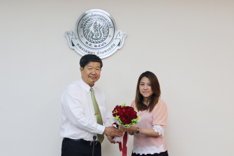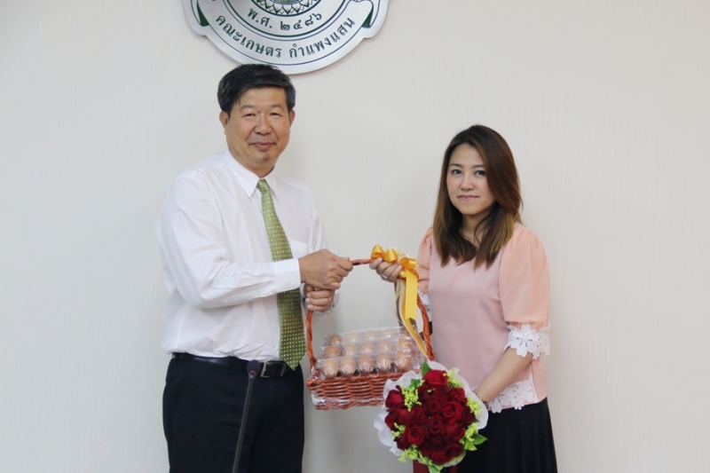 รศ.ดร.ปภพ สินชยกุล คณบดีคณะเกษตร กำแพงแสน มอบช่อดอกไม้และกระเช้าที่ระลึกแสดงความขอบคุณ อาจารย์ ดร. นริศรา อินทะสิริ ซึ่งได้ขอพ้นจากตำแหน่งหัวหน้าภาควิชาส่งเสริมและนิเทศศาสตร์เกษตร เมื่อวันที่ 11 กรกฎาคม 2561