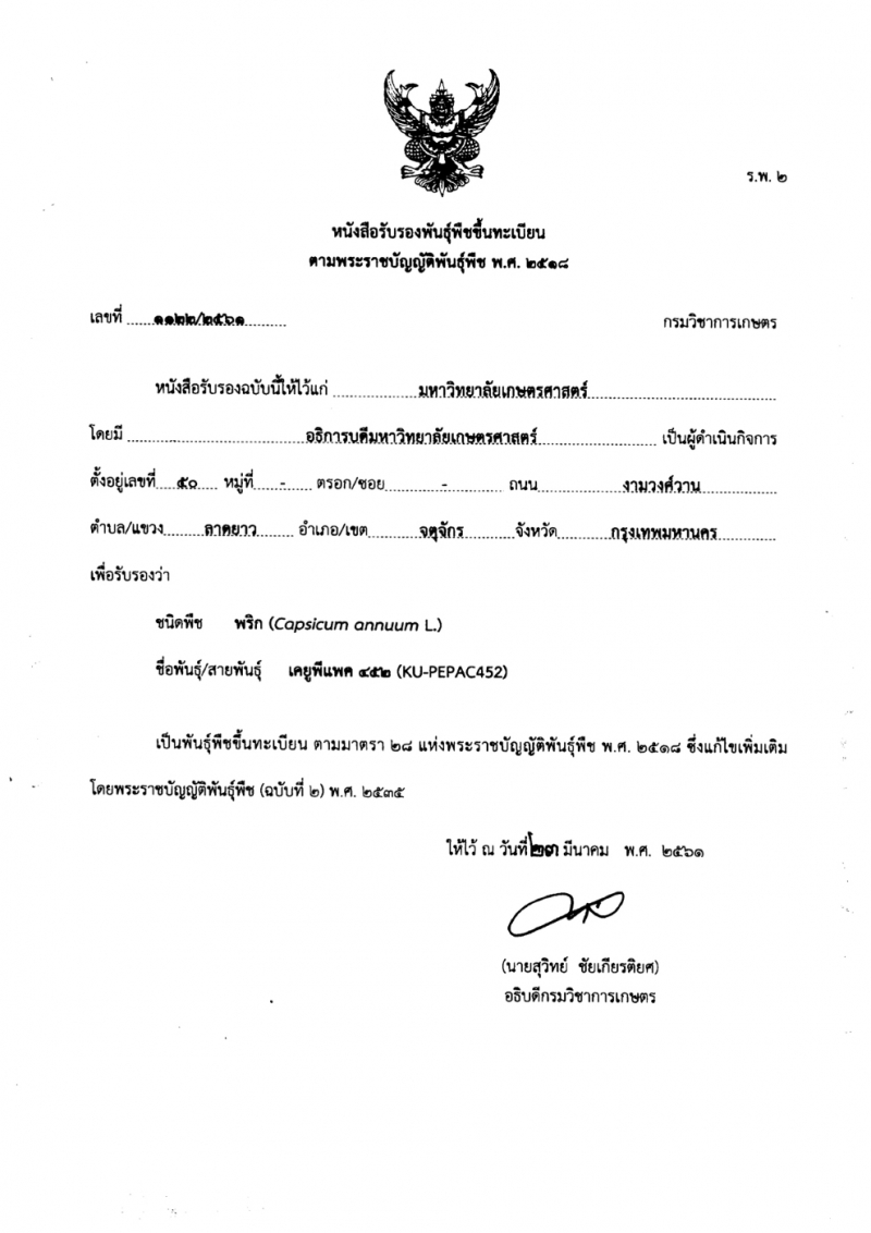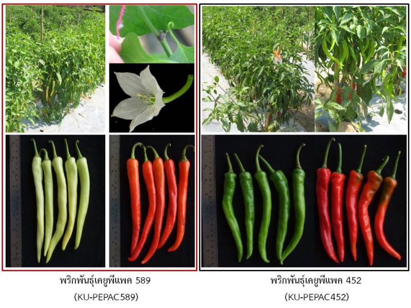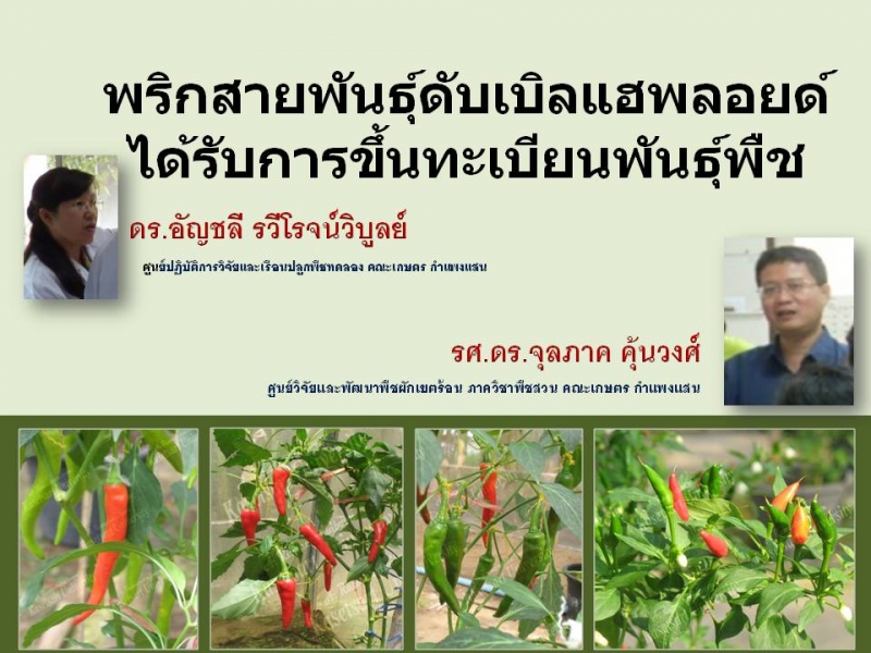 พริกดับเบิลแฮพลอยด์ทั้ง 11 สายพันธุ์ ที่ได้รับหนังสือรับรองการขึ้นทะเบียนพันธุ์ จากกรมวิชาการเกษตร กระทรวงเกษตรและสหกรณ์ เมื่อวันที่ 23 มีนาคม 2561 เป็นพริกที่มีลักษณะที่ดีทางการเกษตรและได้ผ่านการคัดเลือกในแปลงปลูกจากนักปรับปรุงพันธุ์พืช ซึ่งพริกดับเบิลแพลอยด์นี้เป็นส่วนหนึ่งจากผลการดำเนินงานวิจัยเรื่อง การสร้างสายพันธุ์ดับเบิลแฮพลอยด์ของพริก จากการสนับสนุนทุนวิจัยของสำนักงานพัฒนาวิทยาศาสตร์และเทคโนโลยีแห่งชาติ และโครงการวิจัย เรื่องการศึกษาลักษณะทางสัณฐานวิทยาและลักษณะสำคัญทางการเกษตรของพริกประชากรดับเบิลแฮพลอยด์เพื่อการพัฒนาสายพันธุ์ จากการสนับสนุนทุนวิจัย โดยศูนย์ความเป็นเลิศด้านเทคโนโลยีชีวภาพเกษตร มหาวิทยาลัยเกษตรศาสตร์ วิทยาเขตกำแพงแสน จังหวัดนครปฐม งานวิจัยได้เริ่มดำเนินการมาตั้งแต่ปี พ.ศ.2553 - ปัจจุบัน (ตั้งแต่เริ่มดำเนินการศึกษาวิจัยเพื่อสร้างสายพันธุ์พริก) ซึ่งพริกทั้ง 11 สายพันธุ์นี้มีการพัฒนาสายพันธุ์มาจากการเพาะเลี้ยงอับละอองเรณู (anther culture) ของพริกลูกผสมชั่วที่ 1{F1 (CA500XCA2106)} ระหว่างพริกสายพันธุ์ CA500 (ลักษณะผลคล้ายพริกหยวก) เป็นพันธุ์แม่ กับพริกสายพันธุ์ CA2106 เป็นพันธุ์พ่อซึ่งมีคุณสมบัติเด่นคือต้านทานต่อโรคใบด่างแตงที่มีสาเหตุจากเชื้อ CMV (Cucumber Mosaic Virus) ที่ผ่านการประเมินความต้านทานโรคโดย ดร. สุจินต์ ภัทรภูวดล ภาควิชาโรคพืช คณะเกษตร กำแพงแสน มหาวิทยาลัยเกษตรศาสตร์ วิทยาเขตกำแพงแสน ซึ่งพริกทั้งสองพันธุ์นี้ได้รับความอนุเคราะห์เมล็ดพันธุ์จากศูนย์วิจัยและพัฒนาพืชผักเขตร้อน มหาวิทยาลัยเกษตรศาสตร์ วิทยาเขตกำแพงแสน จังหวัดนครปฐม จากนั้น จึงนำพริกลูกผสมชั่วที่ 1 {F1 (CA500XCA2106)} มาเพาะเมล็ดและออกปลูกในเรือนปลูกพืชทดลองเพื่อเก็บอับละอองเรณู มาเพาะเลี้ยงในสภาพปลอดเชื้อและชักนำให้เกิดต้นในสภาวะที่เหมาะสม ต้นพริกที่เกิดขึ้นได้ผ่านการตรวจสอบความเป็นสายพันธุ์แท้ด้วยเทคนิคโมเลกุลเครื่องหมาย และตรวจจำนวนชุดโครโมโซมด้วยเครื่องโฟลไซโตมิเตอร์ (Flow cytometer) เพื่อคัดแยกระหว่างต้นพริกแฮพลอยด์ (โครโมโซม 1 ชุด) กับพริกดับเบิลแฮพลอยด์ ซึ่งประชากรพริกดับเบิลแฮพลอยด์ที่ผลิตได้นี้เกิดจากการเพิ่มจำนวนชุดโครโมโซมได้เองตามธรรมชาติ (spontaneous chromosome doubling) ภายใต้สภาวะการเพาะเลี้ยงที่เหมาะสมซึ่งพริกประชากรดับเบิลแฮพลอยด์นี้ได้นำออกปลูกในสภาพแปลงทดลองเพื่อศึกษาและเก็บข้อมูลลักษณะทางการเกษตรจำนวน 2 ครั้ง และได้มีการออกปลูกเพื่อให้นักปรับปรุงพันธุ์พืชจากภาครัฐและบริษัทผลิตเมล็ดพันธุ์พืชร่วมคัดเลือกสายพันธุ