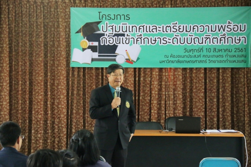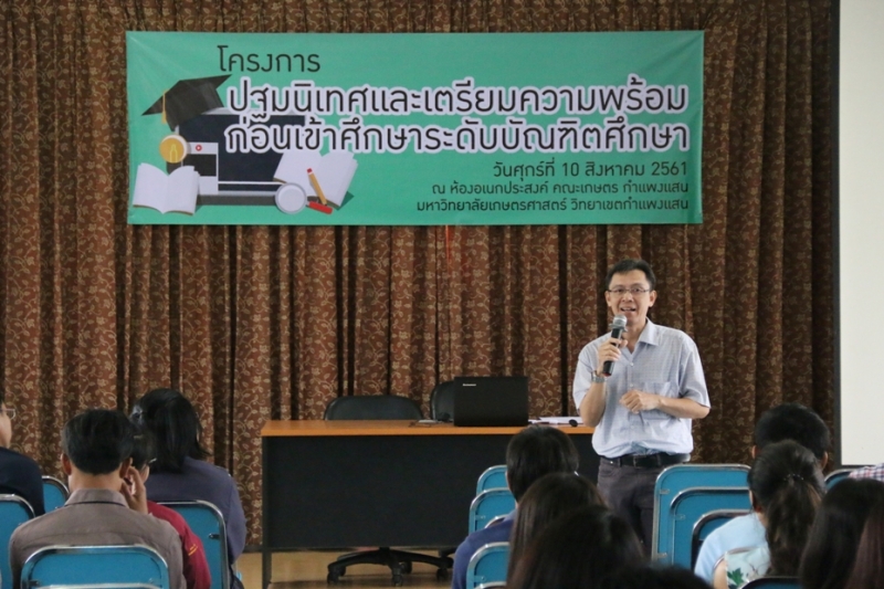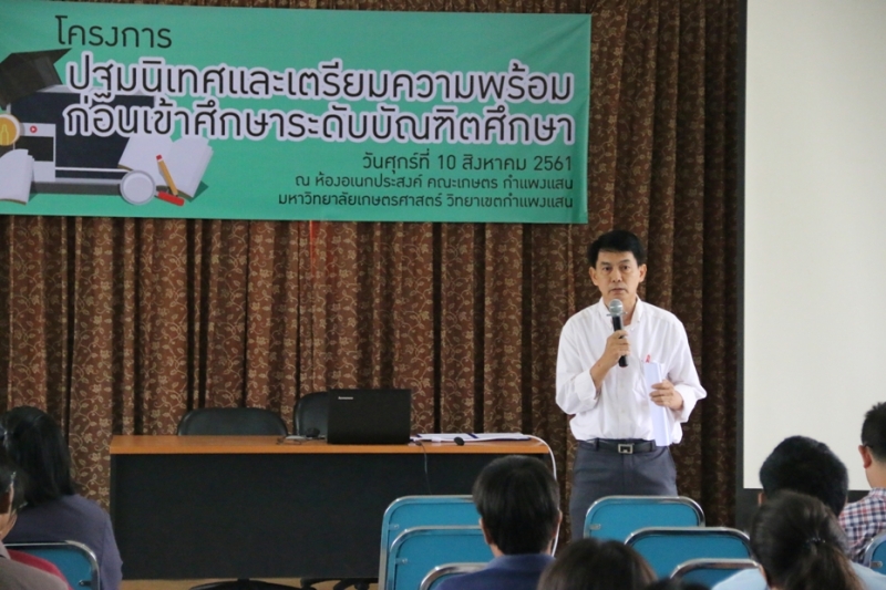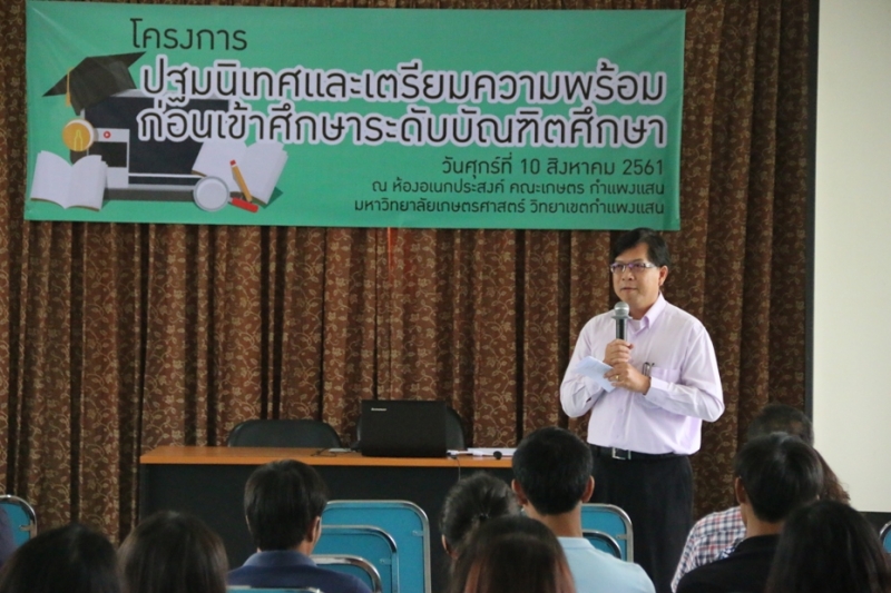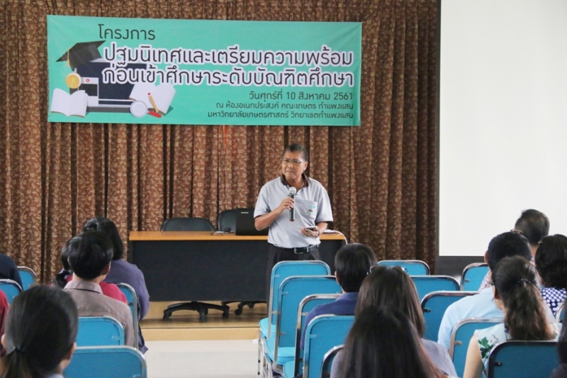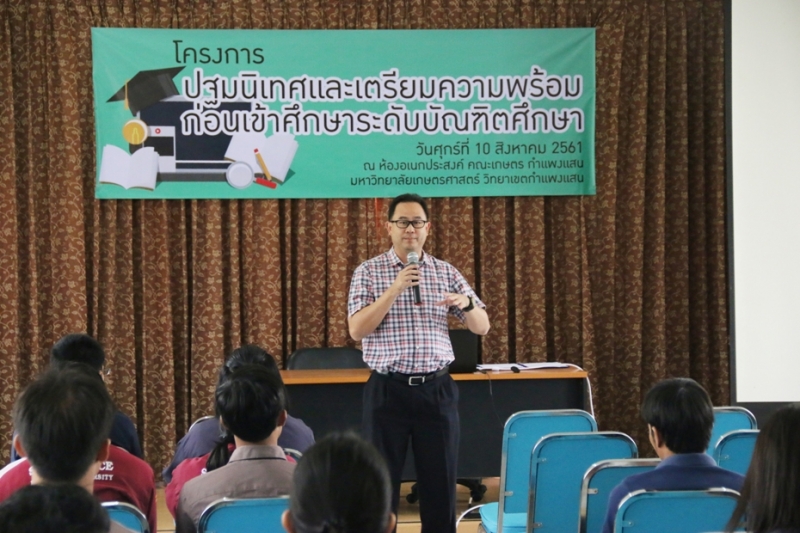 วันที่ 10 สิงหาคม 2561 เวลา 10.00-15.30 น. งานบริการการศึกษา คณะเกษตร กำแพงแสน จัดโครงการ ปฐมนิเทศและเตรียมความพร้อมก่อนเข้าศึกษาระดับบัณฑิตศึกษา ได้รับเกียรติจาก รศ.ดร. ปภพ สินชยกุล คณบดีคณะเกษตร กำแพงแสน เป็นประธานกล่าวเปิดโครงการ และ อาจารย์ ดร. ธวัชชัย อินทร์บุญช่วย ผู้ช่วยคณบดีฝ่ายกิจกรรมนิสิตและศิลปวัฒนธรรม กล่าวรายงาน จากนั้นอาจารย์ผู้รับผิดชอบหลักสูตรกล่าวแนะแนวการเรียนการสอนและการวิจัย ณ ห้องอเนกประสงค์ คณะเกษตร กำแพงแสน และเข้าการศึกษาดูงาน ณ ศูนย์ปฏิบัติการวิจัยและเรือนปลูกพืชทดลอง คณะเกษตร กำแพงแสน มีผู้สนใจเข้าร่วมโครงการจำนวนมาก