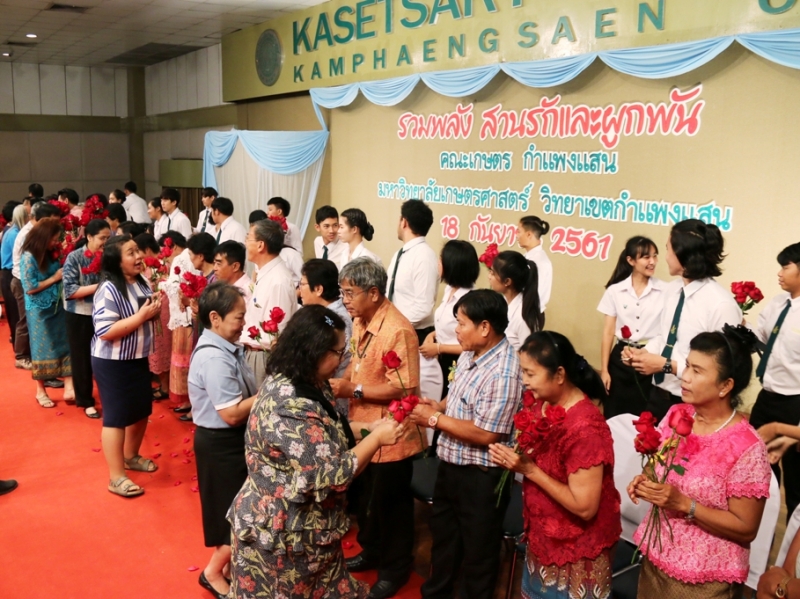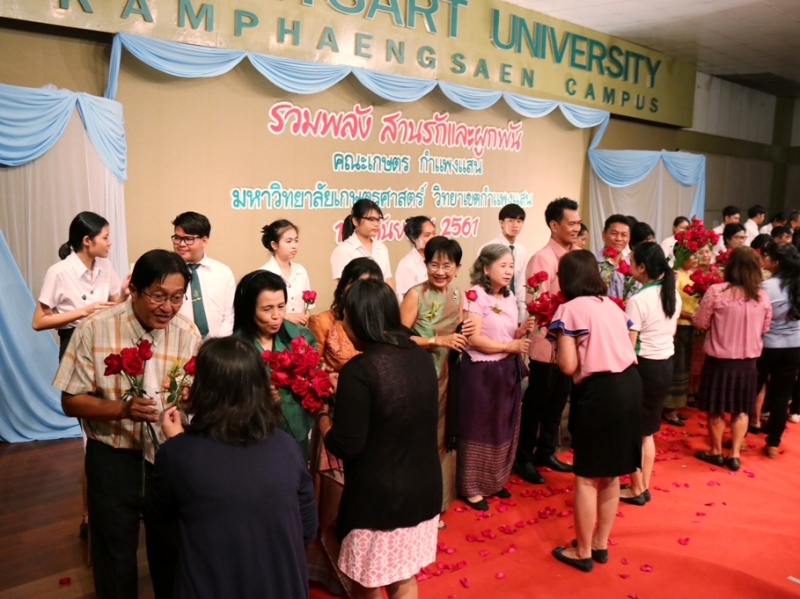 วันที่ 18 กันยายน 2561 คณะเกษตร กำแพงแสน จัดโครงการ รวมพลังใจสานรักและผูกพัน ประจำปี 2561 ให้แก่ผู้เกษียณอายุราชการสังกัดคณะเกษตร กำแพงแสน และจากคณะเกษตร มก. โดย ผศ.ดร.ศุภชัย อำคา รองคณบดีฝ่ายวิเทศสัมพันธ์และสื่อสารองค์กร กล่าวรายงาน รศ.ดร. ปภพ สินชยกุล คณบดีคณะเกษตร กำแพงแสน กล่าวเปิดโครงการและแสดงมุทิตาจิต รศ.ดร. ยงยุทธ โอสถสภา และ รศ.ดร. ธงชัย มาลา อาจารย์อาวุโส กล่าวแสดงมุทิตาจิต รศ.ดร. ธารินทร์ ก้านเหลือง ผู้ช่วยอธิการบดีฝ่ายกิจการนิสิต กีฬา และทำนุบำรุงศิลปวัฒนธรรม ร่วมงานและกล่าวแสดงมุทิตาจิต และ รศ.ดร. ศศิยา ศิริพานิช เป็นผู้แทนผู้เกษียณอายุราชการ กล่าวขอบคุณ จากนั้นเป็นกิจกรรมแสดงมุทิตาจิต มีคณาจารย์และบุคลากรคณะเกษตร กำแพงแสน ร่วมแสดงมุทิตาจิตจำนวนมาก ณ ห้องคอนเวนชั่น อาคารศูนย์มหาวิทยาลัยเกษตรศาสตร์ วิทยาเขตกำแพงแสน