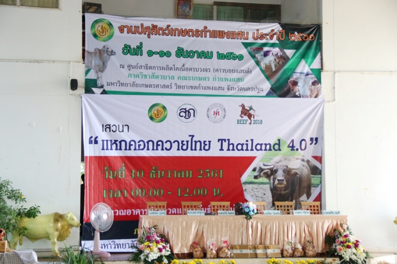 วันที่ 10 ธันวาคม 2561 ภาควิชาสัตวบาล คณะเกษตร กำแพงแสน ร่วมกับสำนักงานพัฒนาการวิจัยการเกษตร (องค์การมหาชน) จัดเสวนา เรื่อง แหกคอกควายไทย Thailand 4.0 โดยได้รับเกียรติจาก ผศ.ดร. สิรินทร์พร สินธุวญิชย์ เป็นประธานกล่าวเปิดการเสวนา มีวิทยากรในภาคส่วนต่างๆ ร่วมเสวนาพูดคุยแลกเปลี่ยนความรู้และประสบการณ์ด้านควายไทย จำนวน 6 ท่าน มีผู้สนใจร่วมฟังการเสวนาจำนวนมาก ณ บริเวณอาคารประกวดแสดงพันธุ์ (อารีน่า) ศูนย์สาธิตการผลิตโคเนื้อครบวงจร (คาวบอยแลนด์) ภาควิชาสัตวบาล คณะเกษตร กำแพงแสน