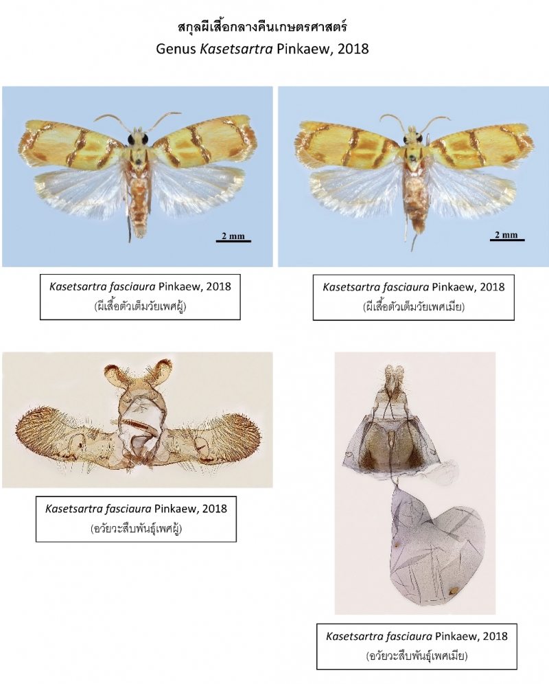 "สกุลผีเสื้อกลางคืนเกษตรศาสตร์ (genus Kasetsartra)" เป็นผีเสื้อกลางคืนสกุลใหม่ของโลก ได้รับการตีพิมพ์เผยแพร่ในวารสาร ZOOTAXA 4532(1): 95-103 ในวันที่ 17 ธันวาคม 2561 โดยตั้งชื่อสกุลเพื่อให้เกียรติกับมหาวิทยาลัยเกษตรศาสตร์ ผีเสื้อสกุลใหม่ของโลกนี้มีการแพร่กระจายเฉพาะในป่าเต็งรังของอุทยานแห่งชาติเขาใหญ่ ซึ่งเป็นผลจากการวิจัยของ รศ.ดร.นันทศักดิ์ ปิ่นแก้ว ในโครงการศึกษาความหลากหลายของผีเสื้อหนอนม้วนใบในอุทยานแห่งชาติเขาใหญ่ในปี พ.ศ. 2553 โดยตัวอย่างต้นแบบ (Holotype) ได้เก็บรักษาไว้ที่ห้องพิพิธภัณฑ์แมลงสุธรรม อารีกุล ภาควิชากีฏวิทยา คณะเกษตร กำแพงแสน มหาวิทยาลัยเกษตรศาสตร์ วิทยาเขตกำแพงแสน จังหวัดนครปฐม