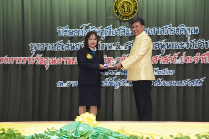 วันที่ 28 ธันวาคม 2561 นางสายน้ำอ้อย สว่างเมฆ พนักงานห้องปฏิบัติงาน คณะเกษตร กำแพงแสน ได้รับคัดเลือกเป็นบุคลากรดีเด่นสายสนับสนุนและช่วยวิชาการ เข้ารับโล่เชิดชูเกียรติและประกาศเกียรติคุณ โครงการรางวัลคุณภาพแห่งมหาวิทยาลัยเกษตรศาสตร์ ประจำปี 2561 ณ อาคารจักรพันธ์พ็ญศิริ