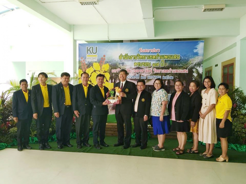 วันที่ 28 มกราคม 2562 รศ.ดร. ปภพ สินชยกุล คณบดีคณะเกษตร กำแพงแสน พร้อมด้วยผู้บริหาร และบุคลากร มอบกระเช้าแสดงความยินดีเนื่องในวันคล้ายวันสถาปนาสำนักงานวิทยาเขตกำแพงแสน ครบรอบ 17 ปี ณ ห้องคอนเวนชั่น อาคารศูนย์มหาวิทยาลัยเกษตรศาสตร์ วิทยาเขตกำแพงแสน