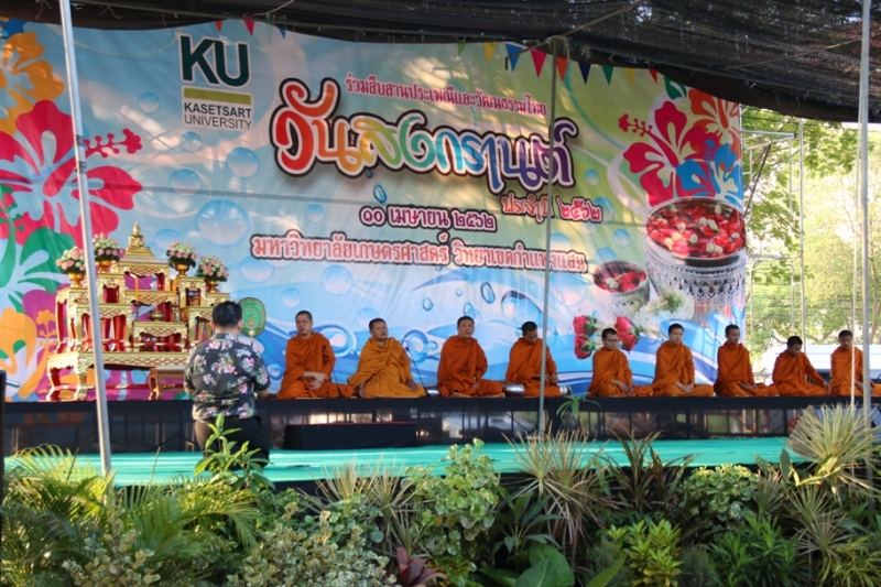 วันที่ 10 เมษายน 2562 รศ.ดร. ปภพ สินชยกุล คณบดีคณะเกษตร กำแพงแสน พร้อมด้วยคณะผู้บริหาร และบุคลากร ร่วมงานวันสงกรานต์ ประจำปี 2562 วิทยาเขตกำแพงแสน โดยในช่วงเช้าร่วมทำบุญตักบาตรพระสงฆ์ จำนวน 9 รูป ร่วมริ้วขบวน กิจกรรมสรงน้ำพระพุทธรูป พระพิรุณ รูปหล่อหม่อมหลวงชูชาติ กำภู รดน้ำขอพรผู้อาวุโส และผู้บริหาร การแข่งขันก่อพระเจดีย์ทราย และ รับประทานอาหารร่วมกัน ณ วิทยาเขตกำแพงแสน