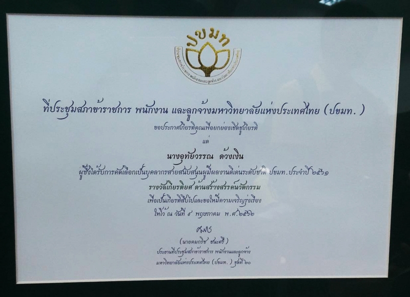 นางอุทัยวรรณ ด้วงเงิน เจ้าหน้าที่วิจัยชำนาญการ สังกัดศูนย์วิจัยและพัฒนาพืชผักเขตร้อน ภาควิชาพืชสวน คณะเกษตร กำแพงแสน เข้ารับรางวัลเกียรติยศ ด้านสร้างสรรค์นวัตกรรม ในผลงาน การปรับปรุงพันธุ์กระเจี๊ยบแดงกำแพงแสน จาก ที่ประชุมสภาข้าราชการ พนักงาน และลูกจ้างมหาวิทยาลัยแห่งประเทศไทย (ปขมท.) เมื่อวันที่ 9 พฤษภาคม 2562 ณ ห้องไทรเงิน กระบี่รีสอร์ท จังหวัดกระบี่
