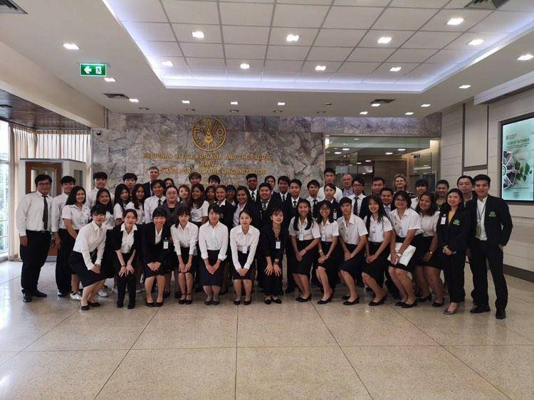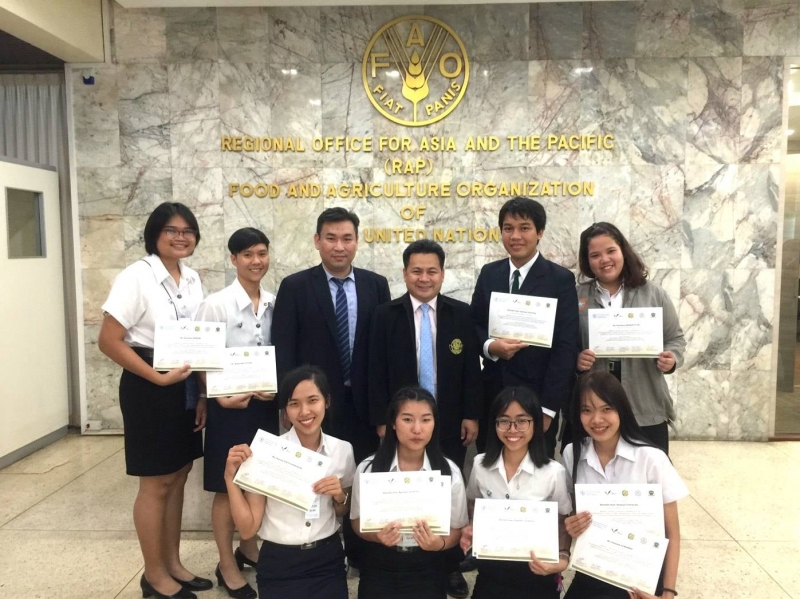 ผู้ช่วยศาสตราจารย์ ดร. ศุภชัย อำคา รองคณบดีฝ่ายสารสนเทศและพัฒนานิสิต และ ผู้ช่วยศาสตราจารย์ ดร. เชิดพงษ์ ขีระจิตต์ ผู้ช่วยคณบดีฝ่ายการศึกษาและประกันคุณภาพ นำนิสิตคณะเกษตร กำแพงแสน ระดับปริญญาตรี จำนวน 8 คน เข้าร่วมประกวดเพื่อนำเสนอผลงานภาคภาษาอังกฤษ ในโครงการ Model United Nations Conference 2019 ภายใต้หัวข้อ Climate Smart Agriculture Minimizing Negative Effects of Climate Change (Adaptation, Resilience and Mitigation) จัดขึ้นโดยองค์การอาหารและเกษตรแห่งสหประชาชาติ กรุงเทพฯ ร่วมกับ Meiji University ประเทศญี่ปุ่น, มหาวิทยาลัยเกษตรศาสตร์, มหาวิทยาลัยศรีนครินทรวิโรฒ และสถาบันการจัดการปัญญาภิวัฒน์ โดยมีทีมเข้าร่วมแข่งขันจำนวนทั้งสิ้น 9 ทีม จัดขึ้นเมื่อวันจันทร์ที่ 9 กันยายน 2562 ณ องค์การอาหารและเกษตรแห่งสหประชาชาติ กรุงเทพฯ (FAO Regional Office for Asia and the Pacific, Bangkok)