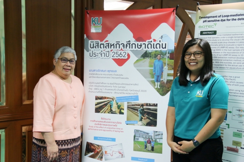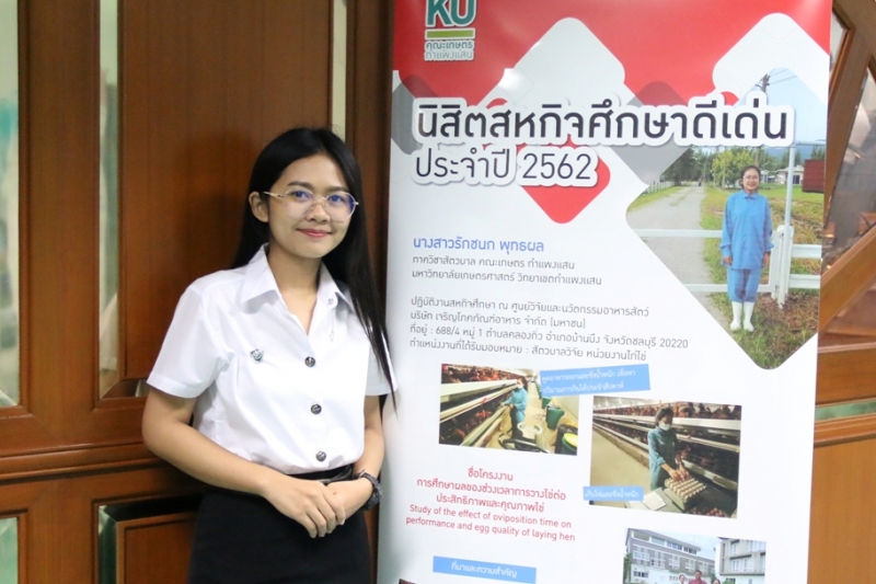 นางสาวรักชนก พุทธผล นิสิตภาควิชาสัตวบาล คณะเกษตร กำแพงแสน ได้รับรางวัลนิสิตสหกิจศึกษาดีเด่น ประเภท "ดีเยี่ยม" ประจำปี 2562 จาก ดร.จงรัก วัชรินทร์รัตน์ รักษาการแทนอธิการบดีมหาวิทยาลัยเกษตรศาสตร์ ในงาน วันสถานประกอบการโครงการสหกิจศกษาพบผู้บริหาร มหาวิทยาลัยเกษตรศาสตร์ ครั้งที่ 17 โดยมี ผศ.ดร. สิรินทร์พร สินธุวณิชย์ หัวหน้าภาควิชาสัตวบาล และ ผศ.ดร.วิราวรรณ จุลโพธิ์ ร่วมแสดงความยินดี ในวันพฤหัสบดีที่ 19 กันยายน พ.ศ. 2562 เวลา 09.00 12.00 น. ณ ห้องประชุมกําพล อดุลวิทย์ ชั้น 2 อาคารสารนิเทศ 50 ปี มหาวิทยาลัยเกษตรศาสตร์ บางเขน โดยนิสิตได้รับรางวัลจากนำเสนอโครงงานสหกิจศึกษาที่ทำร่วมกับสถานประกอบการ ศูนย์วิจัยและนวัตกรรมอาหารสัตว์ บริษัท ซีพีเอฟ (ประเทศไทย) จำกัด (มหาชน)