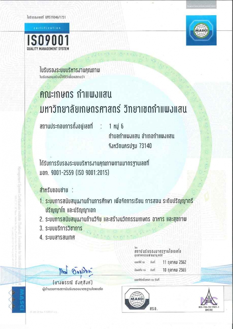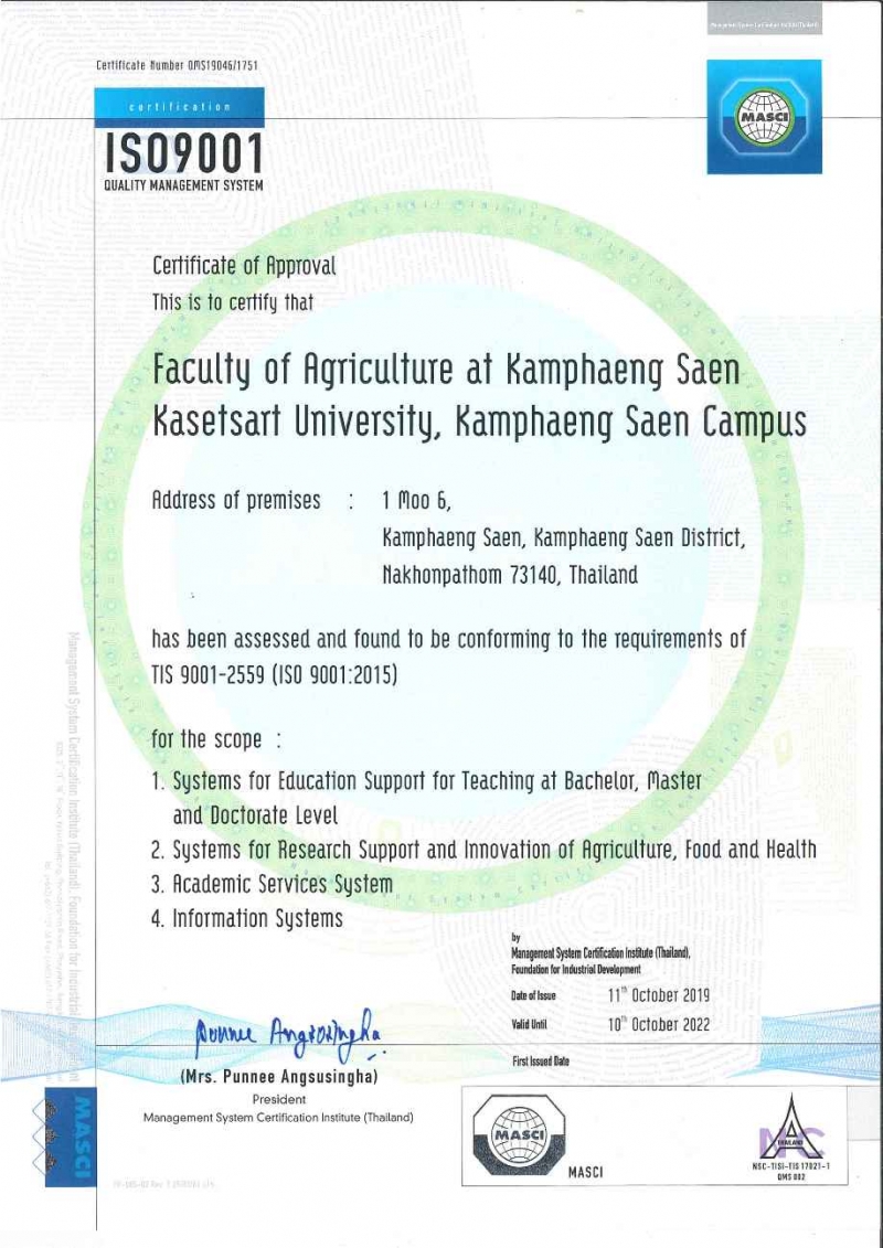 โดย เมื่อวันพฤหัสบดีที่ 28 พฤศจิกายน 2562 รศ.ดร. ปภพ สินชยกุล คณบดีคณะเกษตรกำแพงแสน ผศ.ดร. ศศิธร นาคทอง รองคณบดีฝ่ายวิจัยและบริการวิชาการ พร้อมด้วยผู้บริหาร และบุคลากร คณะเกษตร กำแพงแสน เข้ารับใบรับรองระบบบริหารงานคุณภาพ จาก นางพรรณี อังศุสิงห์ ผู้อำนวยการสถาบันรับรองมาตรฐานไอเอสโอ ณ สำนักงานสถาบันรับรองมาตรฐานไอเอสโอ อาคารยาคูลท์ กรุงเทพฯ