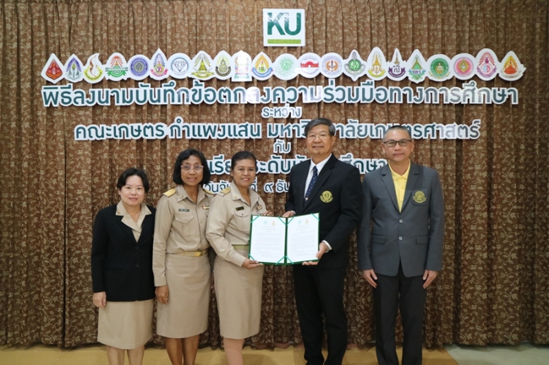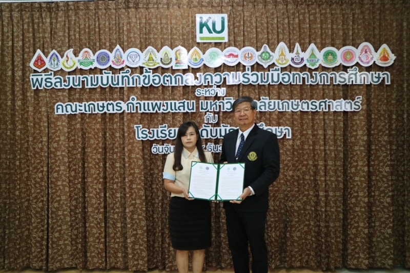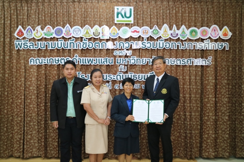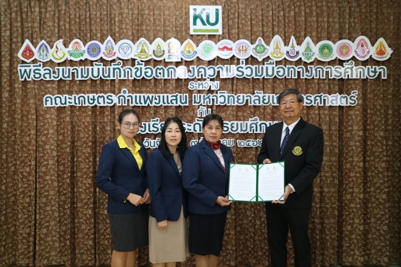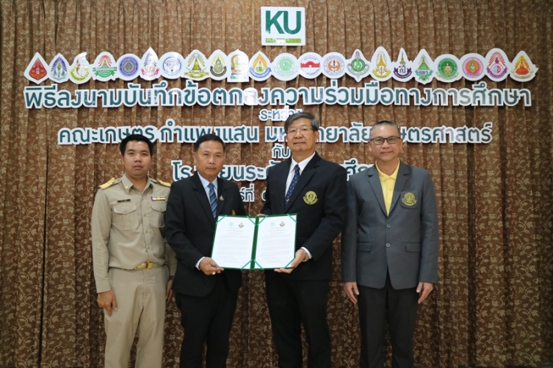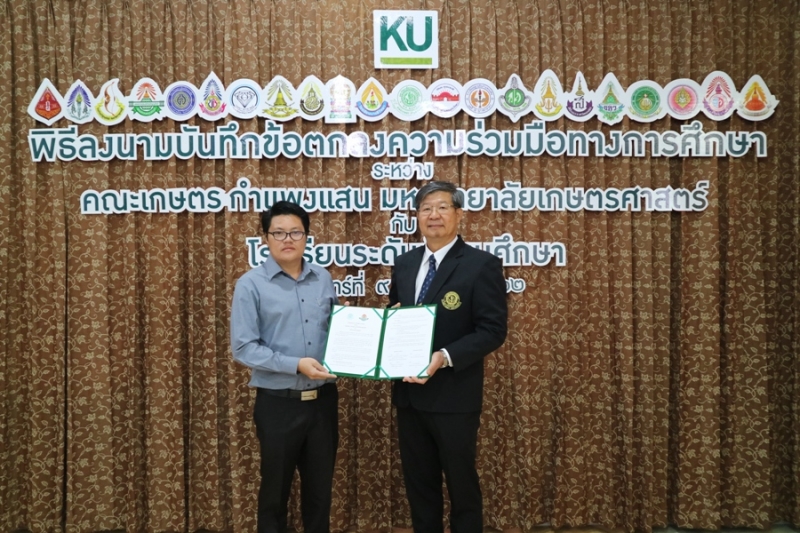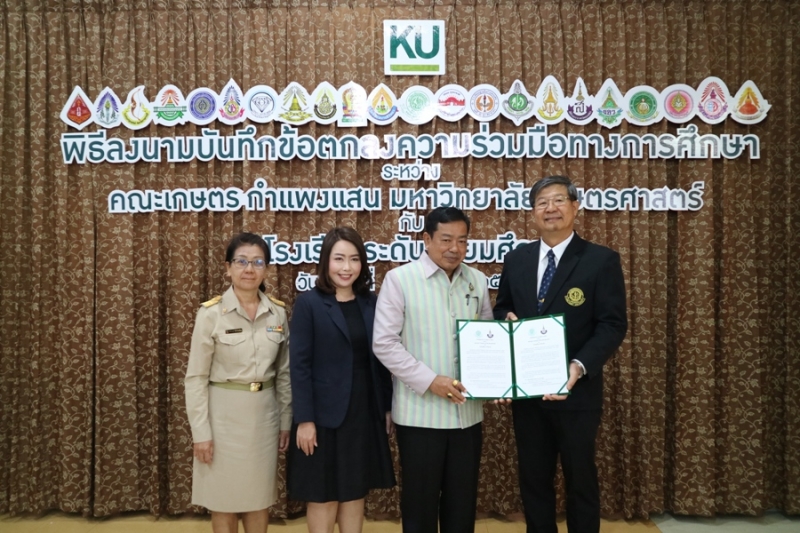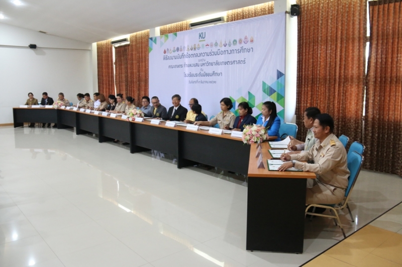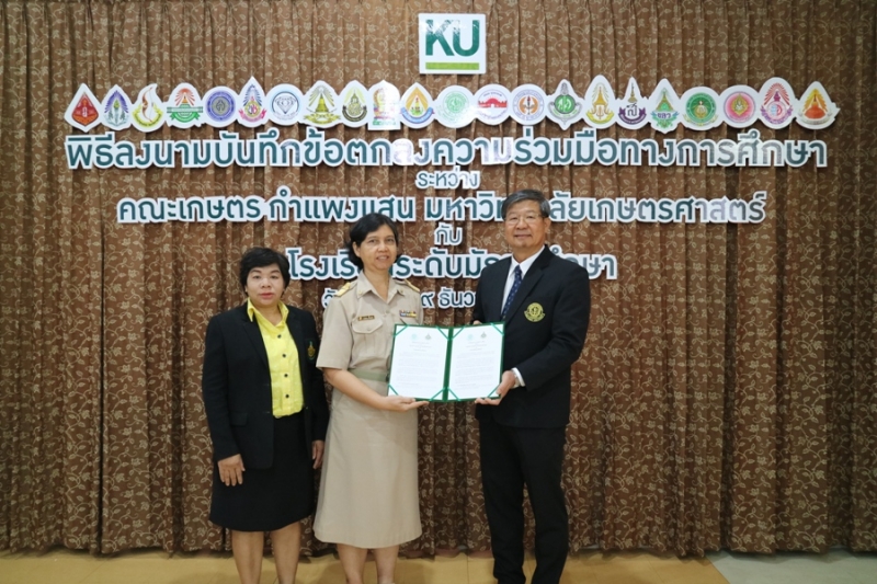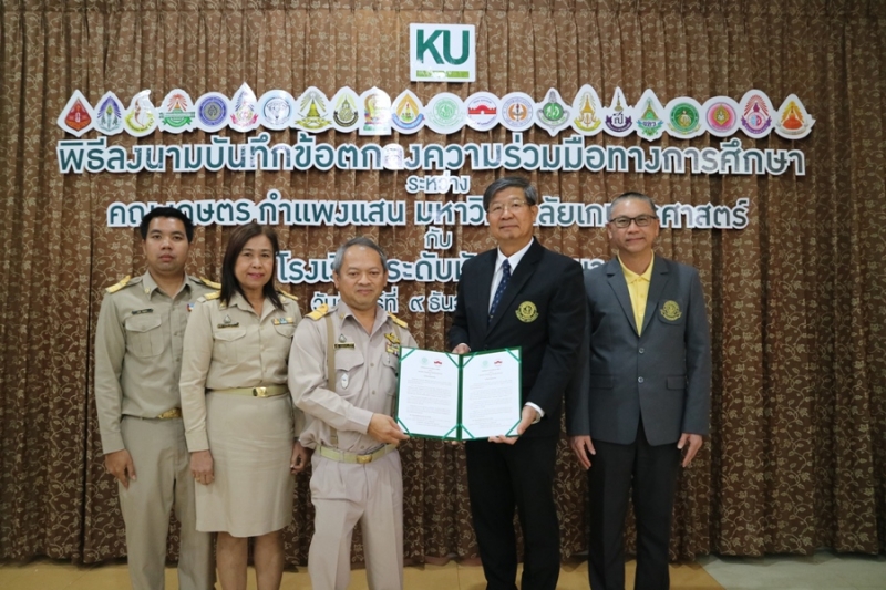 คณะเกษตร กำแพงแสน มหาวิทยาลัยเกษตรศาสตร์ วิทยาเขตกำแพงแสน จัดพิธีลงนามบันทึกข้อตกลงความร่วมมือทางการศึกษา ระหว่างคณะเกษตร กำแพงแสน โดย รองศาสตราจารย์ น.สพ.ดร.อนุชัย ภิญโญภูมิมินทร์ รองอธิการบดีวิทยาเขตกำแพงแสน รองศาสตราจารย์ ดร.ปภพ สินชยกุล คณบดีคณะเกษตร กำแพงแสน ร่วมกับ ผู้อำนวยการและอาจารย์ผู้แทนจากโรงเรียนระดับมัธยมศึกษาที่ร่วมทำข้อตกลงความร่วมมือทางการศึกษา จำนวน 21 โรงเรียน เมื่อวันจันทร์ที่ 9 ธันวาคม 2562 ณ ห้องอเนกประสงค์ คณะเกษตร กำแพงแสน มหาวิทยาลัยเกษตรศาสตร์ วิทยาเขตกำแพงแสน โดยมีรายนามโรงเรียนที่เข้าร่วมข้อตกลงความร่วมมือทางการศึกษา ดังนี้