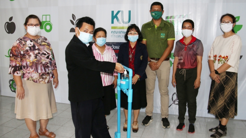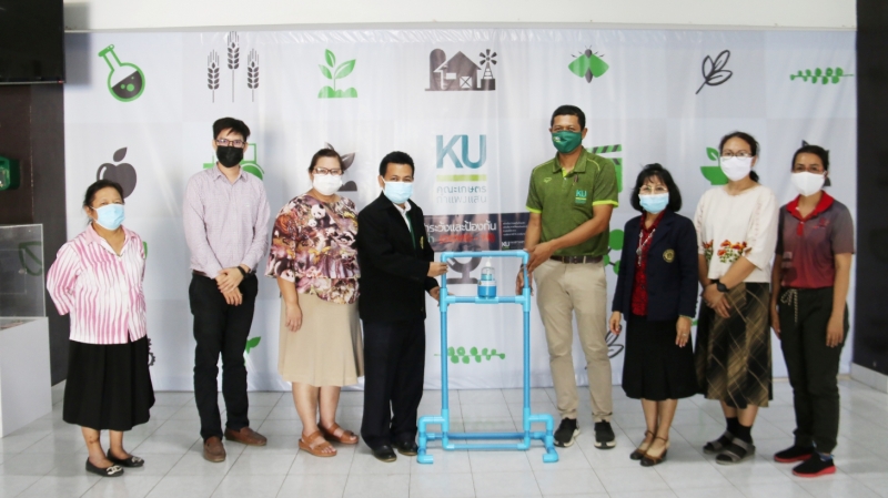 เมื่อวันอังคารที่ 12 พฤษภาคม พ.ศ. 2563 ผศ.ดร.ศุภชัย อำคา รองคณบดีฝ่ายพัฒนาทรัพยากรบุคคลและวิเทศสัมพันธ์ คณะเกษตร กำแพงแสน พร้อมด้วยผู้บริหารและบุคลากร รับมอบอุปกรณ์กดเจลแอลกอฮอล์ล้างมือแบบใช้เท้าเหยียบ จำนวน 1 ชุด จากคณะวิศวกรรมศาสตร์ กำแพงแสน โดย ผศ.กฤษณะ จันทรโชติ รองคณบดีฝ่ายกิจการนิสิต คณะวิศวกรรมศาสตร์ กำแพงแสน พร้อมด้วยผู้บริหารและบุคลากรมาร่วมส่งมอบ สำหรับไว้ให้บริการลดการสัมผัสป้องกันการแพร่กระจายของเชื้อโควิด-19 ณ คณะเกษตร กำแพงแสน จึ0งขอขอบพระคุณมา ณ โอกาสนี้