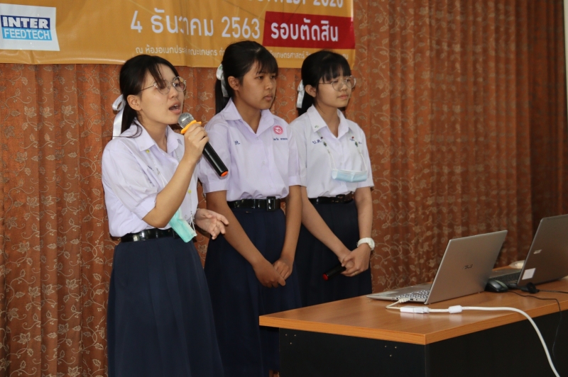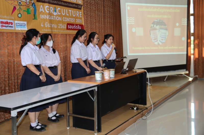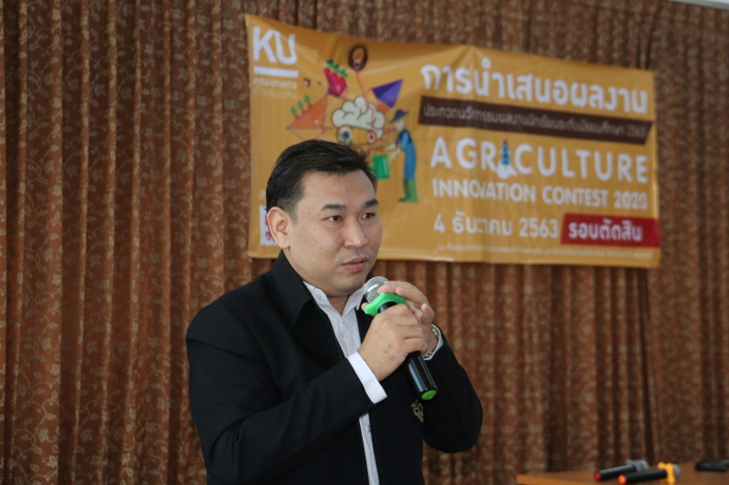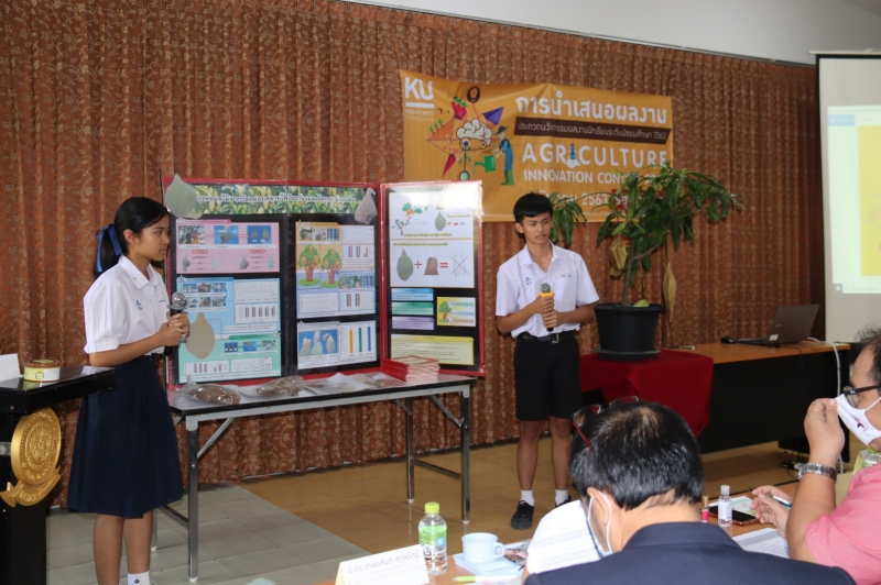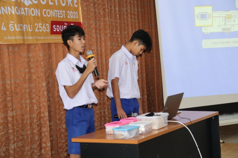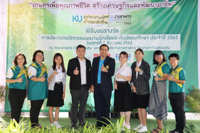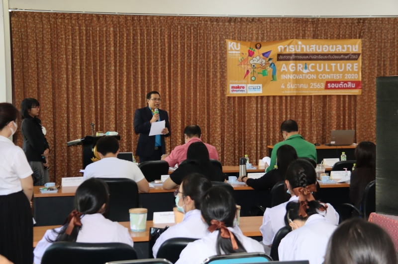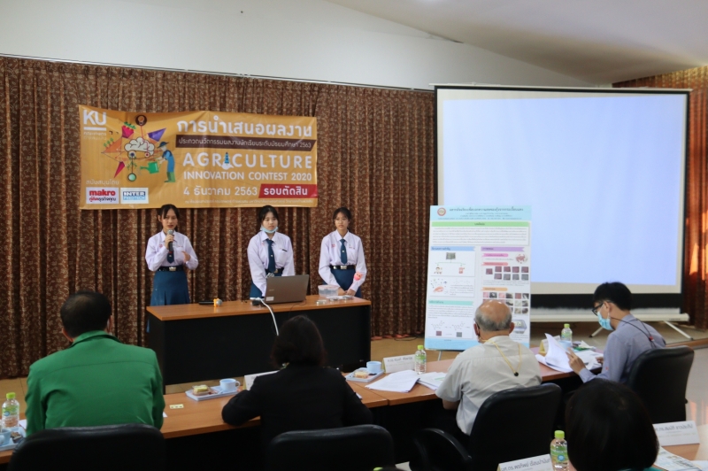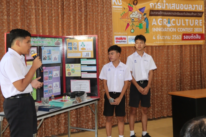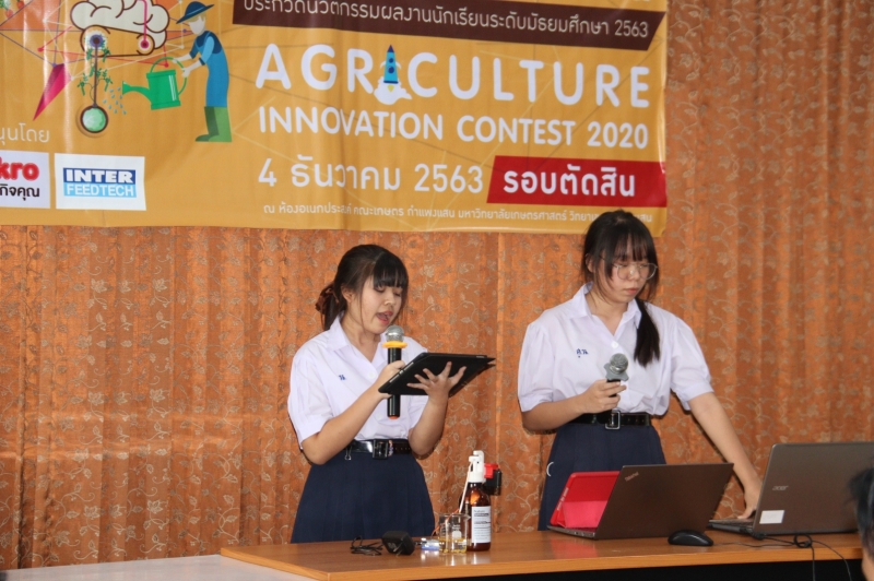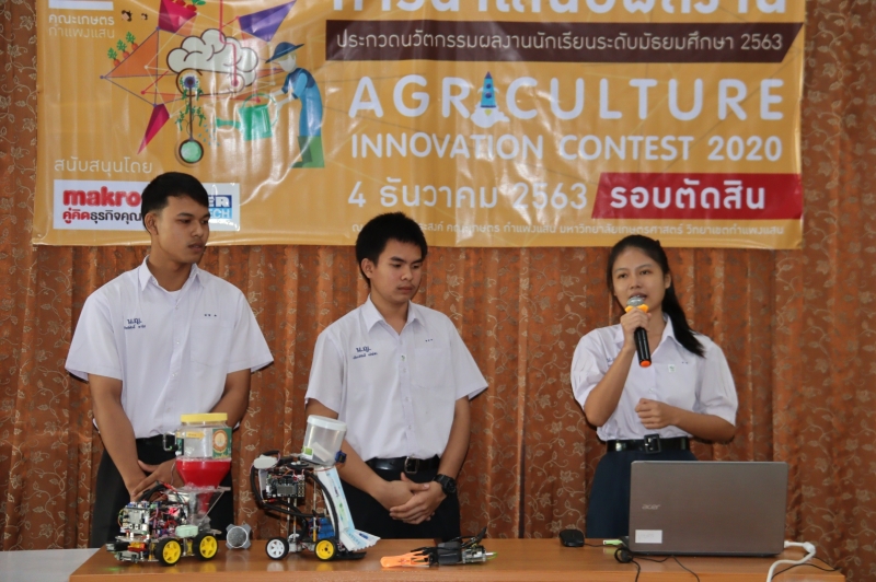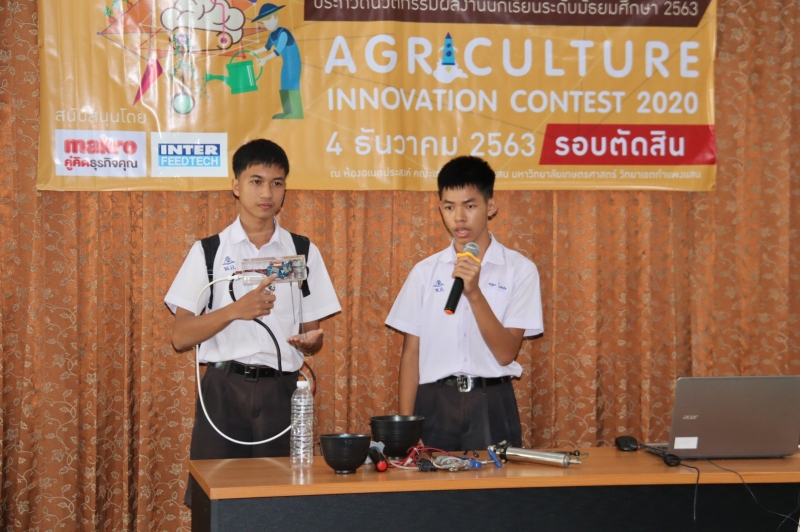 งานบริการการศึกษา คณะเกษตร กำแพงแสน จัดโครงการประกวดนวัตกรรมผลงานนักเรียนระดับมัธยมศึกษา ประจำปี 2563 มีผลงานส่งเข้าร่วมจำนวนกว่า 30 ผลงาน และได้ผ่านการคัดเลือกจากคณะกรรมการผู้ทรงคุณวุฒิ จำนวน 9 ผลงาน เพื่อนำเสนอผลงานวัตกรรมในรอบตัดสิน ซึ่งได้จัดขึ้น เมื่อวันศุกร์ที่ 4 ธันวาคม 2563 ณ ห้องอเนกประสงค์ คณะเกษตร กำแพงแสน โดยได้รับเกียรติจาก ผศ.ดร.เชิดพงษ์ ขีระจิตต์ รองคณบดีฝ่ายสารสนเทศ กล่าวต้อนรับและเปิดงาน อาจารย์ ดร.เกษมสันต์ สกุลรัตน์ ประธานโครงการ กล่าวรายงาน จากนั้นเป็นการนำเสนอผลงานนวัตกรรมของทั้ง 9 ผลงาน โดยมีคณะกรรมการผู้ทรงคุณวุฒิทั้งภายในคณะเกษตร กำแพงแสน และหน่วยงานภายนอกที่เกี่ยวข้อง ร่วมพิจารณา ให้คำแนะนำ และตัดสิน โดย ผศ.ดร.เชิดพงษ์ ขีระจิตต์ รองคณบดีฝ่ายสารสนเทศ ให้เกียรติมอบรางวัลแก่นักเรียนที่ชนะการประกวด โดยได้รับการสนับสนุนเงินรางวัล จาก บริษัท สยามแม็คโคร จำกัด (มหาชน) และ บริษัท อินเตอร์ ฟีดเทค (ประเทศไทย) จำกัด
