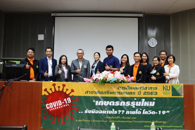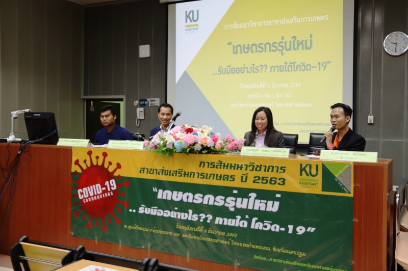 เมื่อวันพฤหัสบดีที่ 3 ธันวาคม พ.ศ. 2563 ภาควิชาส่งเสริมและนิเทศศาสตร์เกษตร คณะเกษตร กำแพงแสน จัดการเสวนาวิชาการ สาขาส่งเสริมการเกษตร เรื่อง เกษตรกรรุ่นใหม่...รับมืออย่างไร??? ภายใต้โควิด-19 ได้รับเกียรติจาก รศ.น.สพ.ดร.อนุชัย ภิญโญภูมิมินทร์ รองอธิการบดีวิทยาเขตกำแพงแสน กล่าวเปิดการสัมมนา และถ่ายรูปร่วมกัน จากนั้นดำเนินการสัมมนา โดยวิทยากร 3 ท่าน ได้แก่ 1.คุณมยุรี บุญญาเสนีย์กุล ผู้อำนวยการกลุ่มยุวเกษตรกร กรมส่งเสริมการเกษตร 2.ผู้ช่วยศาสตราจารย์ ดร.ศรัณยพงศ์ เที่ยงธรรม อาจารย์คณะบริหารธุรกิจ มหาวิทยาลัยกรุงเทพ และ 3.คุณเดี่ยว บ้านแพ้ว เกษตรกรรุ่นใหม่ Young Smart Farmer ดำเนินรายการโดย อาจารย์สุเมธ ชัยไธสงค์ ณ อาคารศูนย์เรียนรวม 3 ห้อง 305 มหาวิทยาลัยเกษตรศาสตร์ วิทยาเขตกำแพงแสน