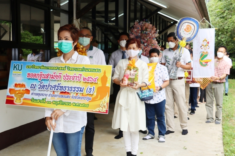 ผู้ช่วยศาสตราจารย์ ดร.ชัยสิทธิ์ ทองจู คณบดีคณะเกษตร กำแพงแสน พร้อมด้วยคณะผู้บริหาร คณาจารย์ และบุคลากร ร่วมพิธีทอดกฐินสามัคคี มหาวิทยาลัยเกษตรศาสตร์ วิทยาเขตกำแพงแสน ประจำปี 2564 ร่วมกับผู้บริหารและบุคลากรวิทยาเขตกำแพงแสน นำโดย รองศาสตราจารย์ น.สพ.ดร.อนุชัย ภิญโญภูมิมินทร์ รองอธิการบดีวิทยาเขตกำแพงแสน เพื่อสมทบทุนบูรณะศาลาอเนกประสงค์ โดยมียอดเงินสมทบทุนจากผู้บริหาร คณาจารย์ บุคลากร และนิสิต วิทยาเขตกำแพงแสน ทั้งสิ้น 115,399 บาท (หนึ่งแสนหนึ่งหมื่นห้าพันสามร้อยเก้าสิบเก้าบาทถ้วน) ณ วัดป่าศรัทธาธรรม ตำบลทุ่งขวาง อำเภอกำแพงแสน จังหวัดนครปฐม เมื่อวันเสาร์ที่ 13 พฤศจิกายน พ.ศ. 2564