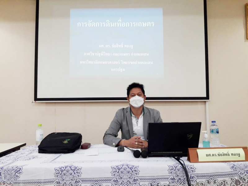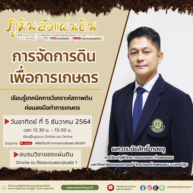 วันอาทิตย์ที่ 5 ธันวาคม พ.ศ. 2564 ผู้ช่วยศาสตราจารย์ ดร.ชัยสิทธิ์ ทองจู ภาควิชาปฐพีวิทยา คณะเกษตร กำแพงแสน ได้รับเชิญเป็นวิทยากรบรรยายเรื่อง การจัดการดินเพื่อการเกษตร เทคนิคการวิเคราะห์ดินก่อนลงมือทำการเกษตร ณ สำนักงานพิพิธภัณฑ์เกษตรเฉลิมพระเกียรติพระบาทสมเด็จพระเจ้าอยู่หัว (องค์การมหาชน)