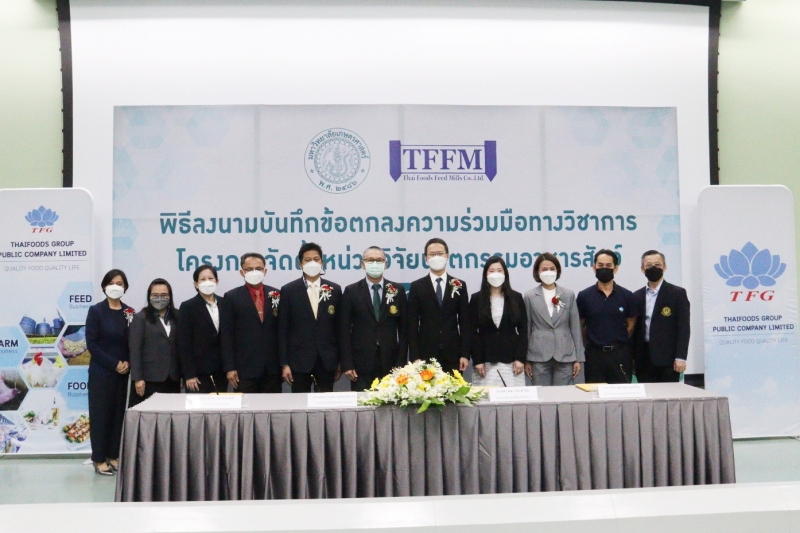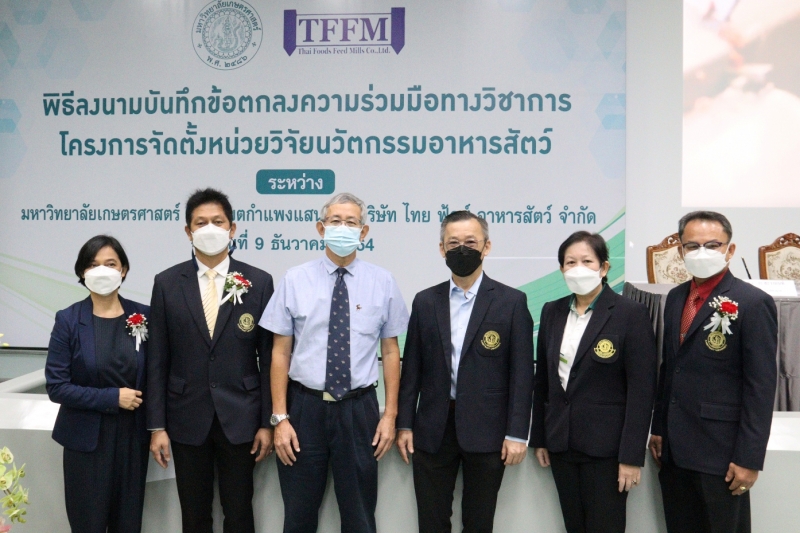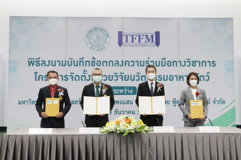 วันพฤหัสบดีที่ 9 ธันวาคม พ.ศ. 2564 มีพิธีลงนามความร่วมมือภายใต้โครงการจัดตั้งหน่วยวิจัยนวัตกรรมอาหารสัตว์ ระหว่าง มหาวิทยาลัยเกษตรศาสตร์ วิทยาเขตกำแพงแสน และ บริษัท ไทย ฟู้ดส์ อาหารสัตว์ จำกัด ลงนามโดย รศ.น.สพ.ดร.อนุชัย ภิญโญภูมิมินทร์ รองอธิการบดีวิทยาเขตกำแพงแสน และ น.สพ. เพชร นันทวิสัย ประธานเจ้าหน้าที่ฝ่ายปฏิบัติการ บริษัท ไทย ฟู้ดส์ อาหารสัตว์ จำกัด พยานโดย ศ.ดร. สุริยะ สะวานนท์ หัวหน้าภาควิชาสัตวบาล คณะเกษตร กำแพงแสน และ ดร. ภัทราพรรณ รุ่งเจริญ ผู้ช่วยประธานกลุ่มพัฒนาสินค้าใหม่ บริษัท ไทย ฟู้ดส์ อาหารสัตว์ จำกัด พร้อมด้วยผู้บริหารและบุคลากรทั้ง 2 ฝ่าย ร่วมเป็นสักขีพยาน ณ ห้อง 102 อาคารศูนย์เรียนรวม 4 มหาวิทยาลัยเกษตรศาสตร์ วิทยาเขตกำแพงแสน