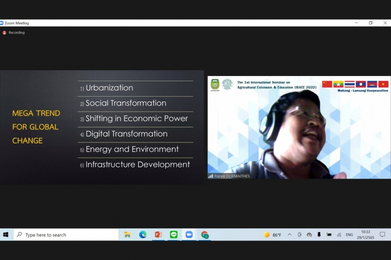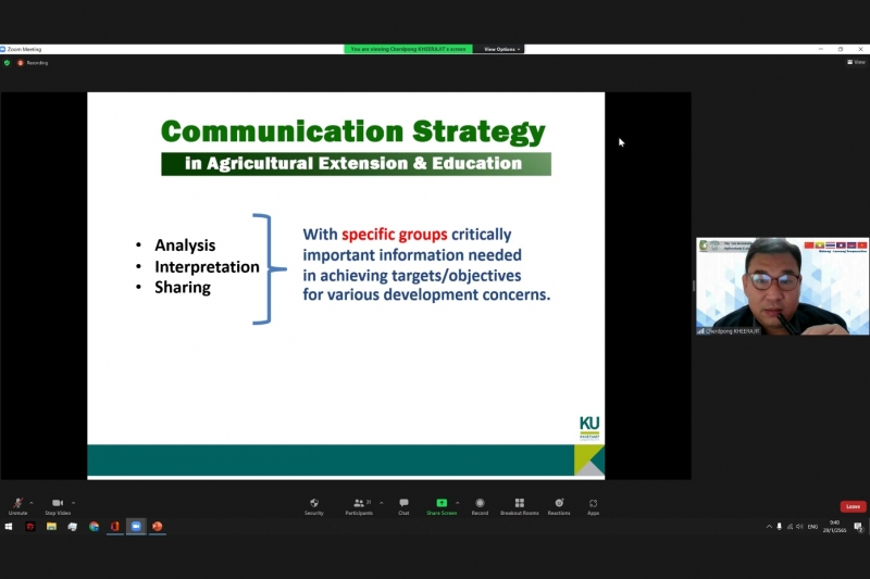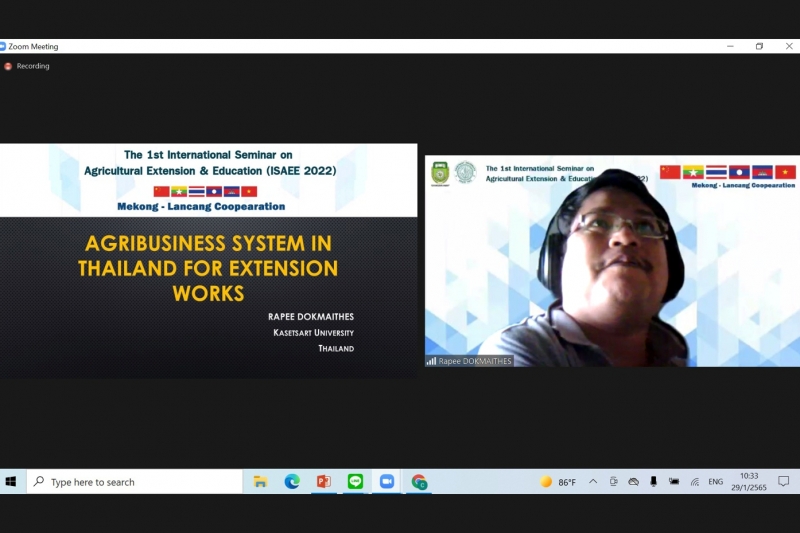 วันที่ 29 มกราคม พ.ศ. 2565 ผศ.ดร.รพี ดอกไม้เทศ หัวหน้าภาควิชาส่งเสริมและนิเทศศาสตร์เกษตร และ ผศ.ดร.เชิดพงษ์ ขีระจิตต์ อาจารย์ประจำภาควิชาส่งเสริมและนิเทศศาสตร์เกษตร คณะเกษตร กำแพงแสน ได้รับเชิญเป็น Keynote Speaker ในงานสัมมนาวิชาการนานาชาติ "The 1st International Seminar on Agricultural Extension & Education (ISAEE 2022)" ในรูปแบบออนไลน์ จัดโดย Yezin Agricultural University ประเทศพม่า ร่วมกับ มหาวิทยาลัยเกษตรศาสตร์