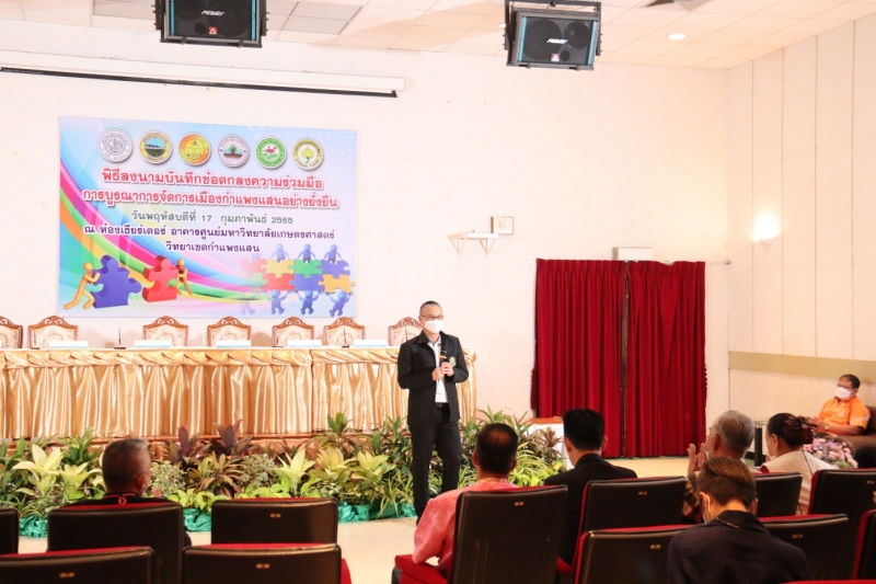 วันพฤหัสบดีที่ 17 กุมภาพันธ์ พ.ศ. 2565 ผู้ช่วยศาสตราจารย์ ดร.ชัยสิทธิ์ ทองจู คณบดีคณะเกษตร กำแพงแสน ร่วมเป็นสักขีพยานในพิธีลงนามบันทึกข้อตกลงความร่วมมือการบูรณาการจัดการเมืองกำแพงแสนอย่างยั่งยืน และร่วมประชุม เพื่อแสดงเจตจำนงในการพัฒนา ณ ห้องเธียร์เตอร์ อาคารศูนย์มหาวิทยาลัยเกษตรศาสตร์ วิทยาเขตกำแพงแสน