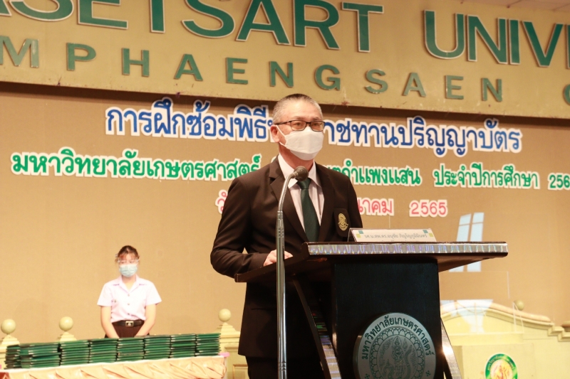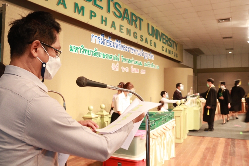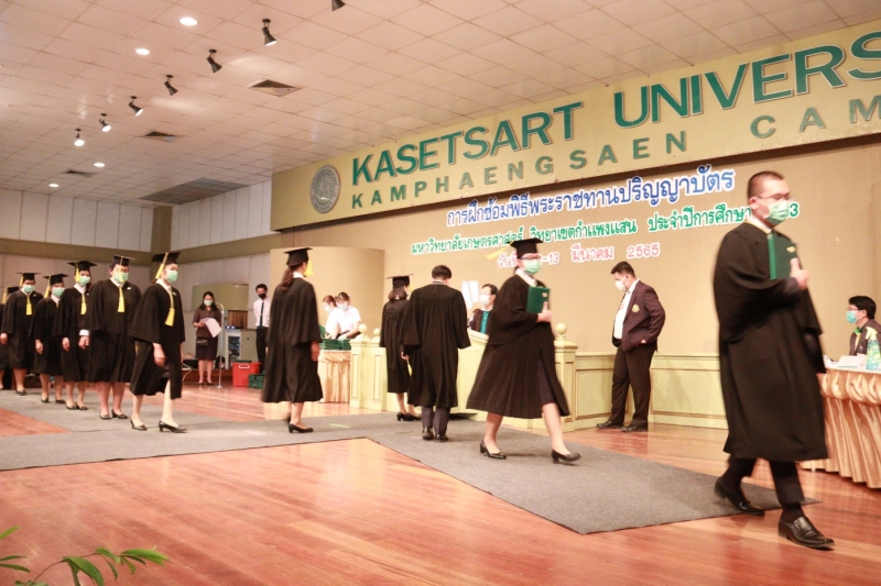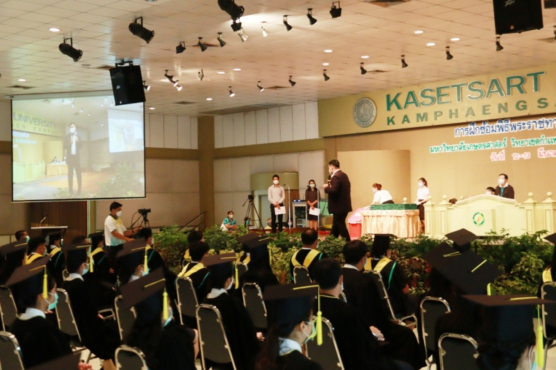 วันอาทิตย์ที่ 13 มีนาคม พ.ศ. 2565 คณะกรรมการฝึกซ้อมฯ คณะเกษตร กำแพงแสน นำดุษฎีบัณฑิต มหาบัณฑิต และบัณฑิต เข้ารับการฝึกซ้อมพิธีพระราชทานปริญญาบัตร วิทยาเขตกำแพงแสน ประจำปีการศึกษา 2563 โดยมีคณะกรรมการกลาง ดำเนินการฝึกซ้อม ได้รับเกียรติจาก รศ.น.สพ.ดร.อนุชัย ภิญโญภูมิมินทร์ รองอธิการบดีวิทยาเขตกำแพงแสน กล่าวแสดงความยินดีแก่ผู้สำเร็จการศึกษาทุกท่าน ณ ห้องคอนเวนชั่น อาคารศูนย์มหาวิทยาลัยเกษตรศาสตร์ กพส.