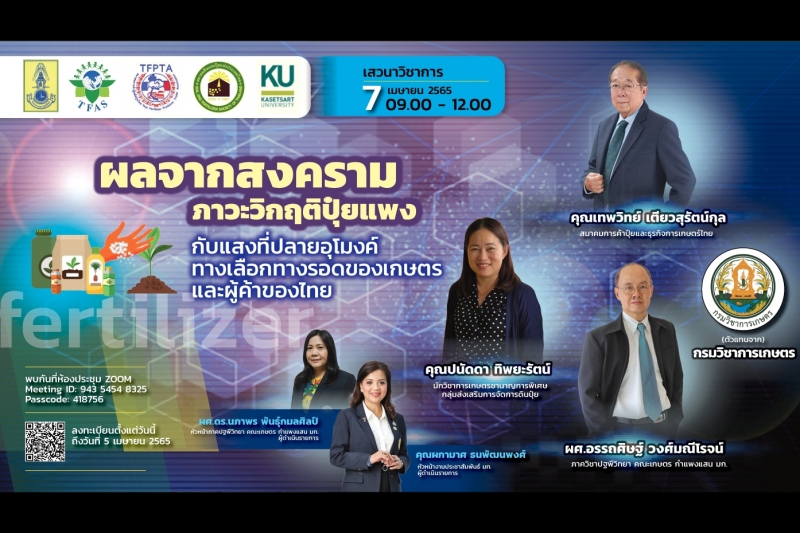 วันที่ 7 เมษายน 2565 ผศ.ดร.ชัยสิทธิ์ ทองจู คณบดีคณะเกษตร กำแพงแสน รองประธานการจัดเสวนาฯ นำทีมคณาจารย์ภาควิชาปฐพีวิทยา คณะเกษตร กำแพงแสน เข้าร่วมการเสวนาวิชาการ เรื่อง ผลจากสงคราม!!! วิกฤตปุ๋ยแพงกับแสงที่ปลายอุโมงค์ : ทางเลือกทางรอดของเกษตรกรและผู้ค้าของไทย ซึ่งดำเนินการโดยมหาวิทยาลัยเกษตรศาสตร์ ด้วยความร่วมมือของภาควิชาปฐพีวิทยา คณะเกษตร กำแพงแสน และภาควิชาปฐพีวิทยา คณะเกษตร ร่วมกับภาคีเครือข่าย ในรูปแบบผสมผสาน ณ ห้องประชุมรวงข้าว อาคารวชิราณุสรณ์ zoom meting ถ่ายทอดสดผ่าน nontri live ระบบ Youtube และสถานีวิทยุ ม.ก. มีผู้เข้าร่วมประชุมประมาณ 400 คน โดยท่านอธิการบดี มหาวิทยาลัยเกษตรศาสตร์ได้มอบหมาย รศ.ดร.สุตเขตต์ นาคะเสถียร รองอธิการบดีฝ่ายวิจัยและสร้างสรรค์ กล่าวเปิดการเสวนา ในการนี้คณาจารย์จากภาควิชาปฐพีวิทยา คณะเกษตร กำแพงแสน ร่วมเป็นกรรมการจัดการเสวนา เป็นวิทยากร และผู้ดำเนินรายการในครั้งนี้ด้วย