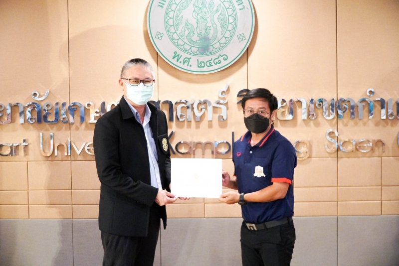 วันพุธที่ 15 มิถุนายน 2565 บุคลากร คณะเกษตร กำแพงแสน ได้แก่ นายทศพล ศรีศรทอง สำนักงานเลขานุการ และนายพิเชษฐ เล่าเปี่ยม ภาควิชาสัตวบาล เข้ารับมอบประกาศเกียรติคุณ จาก รศ.น.สพ.ดร.อนุชัย ภิญโญภูมิมินทร์ รองอธิการบดีวิทยาเขตกำแพงแสน ที่ได้สร้างชื่อเสียงในการร่วมทีมฟุตบอลวิทยาเขตกำแพงแสน คว้าแชมป์ฟุตบอลประเพณีบุคลากร มก. ครั้งที่ 55 ประจำปี 2565 ชิงถ้วยพระราชทาน สมเด็จพระเจ้าน้องนางเธอ เจ้าฟ้าจุฬาภรณวลัยลักษณ์ อัครราชกุมารี กรมพระศรีสวางควัฒน วรขัตติยราชนารี ณ ห้องประชุมวิชาการ 1 ชั้น 2 อาคารศูนย์ มก.กพส. ซึ่งจัดการแข่งขันในระหว่างวันที่ 6-31 พฤษภาคม 2565 ณ สนามอินทรีจันทรสถิตย์