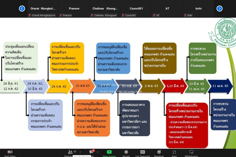 วันจันทร์ที่ 27 มิถุนายน พ.ศ. 2565 ผู้ช่วยศาสตราจารย์ ดร.ชัยสิทธิ์ ทองจู คณบดีคณะเกษตร กำแพงแสน พร้อมด้วยหัวหน้าภาควิชา นำเสนอภารกิจด้านการเรียนการสอน การวิจัย และบริการวิชาการ โครงสร้างอัตรากำลัง และแนวทางการพิจารณาทบทวนโครงสร้างหน่วยงานภายในคณะเกษตร กำแพงแสน ใน การประชุมคณะทำงานเพื่อทบทวนโครงสร้างการบริหารทางวิชาการและการพัฒนาวิชาการด้านการเกษตรของคณะกลุ่มสาขาวิชาเกษตรและสิ่งแวดล้อม มหาวิทยาลัยเกษตรศาสตร์ ครั้งที่ 2/2565 ณ ห้องประชุม 9 ชั้น 2 อาคารสารนิเทศ 50 ปี มหาวิทยาลัยเกษตรศาสตร์ บางเขน โดยมีผู้บริหาร คณาจารย์ และบุคลากรคณะเกษตร กำแพงแสน ร่วมรับฟัง ในรูปแบบออนไลน์
