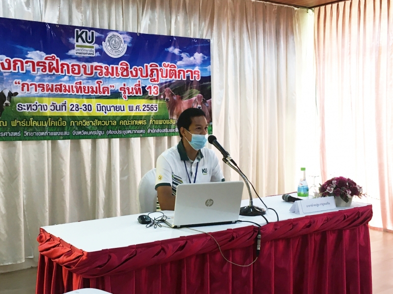 วันที่ 28 30 มิถุนายน พ.ศ. 2565 ฟาร์มโคนม/โคเนื้อ ภาควิชาสัตวบาล คณะเกษตร กำแพงแสน มหาวิทยาลัยเกษตรศาสตร์ วิทยาเขตกำแพงแสน โดย อาจารย์ นาม บัวทอง หัวหน้าโครงการฝึกอบรมเชิงปฏิบัติการ การผสมเทียมโค รุ่นที่ 13 ให้กับกลุ่มเกษตรกรผู้เลี้ยงโคนม/โคเนื้อ ที่สนใจ และบุคคลทั่วไป เพื่อเป็นการเพิ่มพูนความรู้ ความเข้าใจ และสามารถนำทักษะ เทคนิคการปฏิบัติการผสมเทียมโคไปใช้ประโยชน์ด้วยตนเองอย่างแท้จริง เป็นแนวทางในการประกอบอาชีพการเลี้ยงโคให้ดีขึ้นต่อไปได้ ซึ่งได้รับเกียรติจากอาจารย์ คงปฐม กาญจนเสริม รองหัวหน้าภาควิชาสัตวบาล เป็นประธานกล่าวเปิดโครงการและให้โอวาท ณ ฟาร์มโคนม/โคเนื้อ ภาควิชาสัตวบาล คณะเกษตร กำแพงแสน มหาวิทยาลัยเกษตรศาสตร์ วิทยาเขตกำแพงแสน
