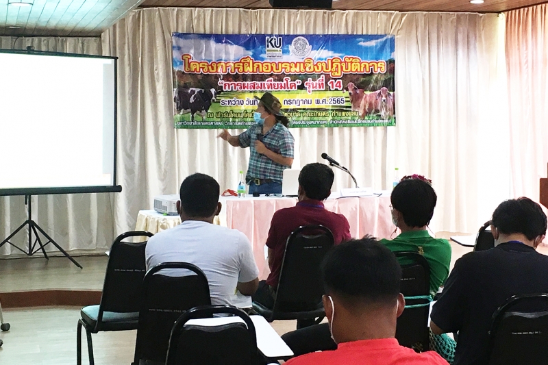 วันที่ 19 21 กรกฎาคม พ.ศ. 2565 ฟาร์มโคนม/โคเนื้อ ภาควิชาสัตวบาล คณะเกษตร กำแพงแสน โดย อาจารย์ นาม บัวทอง หัวหน้าโครงการ จัดโครงการฝึกอบรมเชิงปฏิบัติการ การผสมเทียมโค รุ่นที่ 14 ให้กับกลุ่มเกษตรกรผู้เลี้ยงโคนม/โคเนื้อ ที่สนใจ และบุคคลทั่วไป เพื่อเป็นการเพิ่มพูนความรู้ ความเข้าใจ และสามารถนำทักษะ เทคนิคการปฏิบัติการผสมเทียมโคไปใช้ประโยชน์ด้วยตนเองอย่างแท้จริง เป็นแนวทางในการประกอบอาชีพการเลี้ยงโคให้ดีขึ้นต่อไปได้ ซึ่งได้รับเกียรติจาก ศาสตราจารย์ ดร.สุริยะ สะวานนท์ หัวหน้าภาควิชาสัตวบาล เป็นประธานกล่าวให้โอวาทและมอบใบประกาศนียบัตร ณ ฟาร์มโคนม/โคเนื้อ ภาควิชาสัตวบาล คณะเกษตร กำแพงแสน