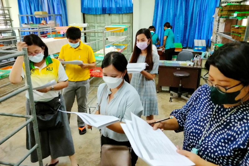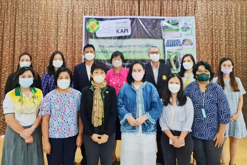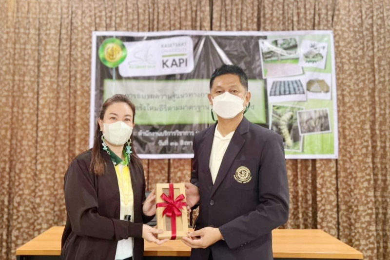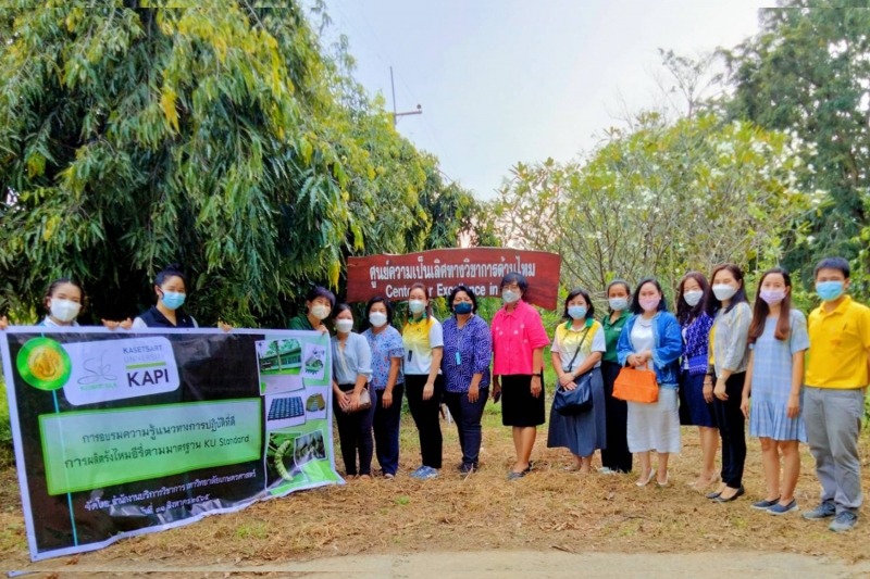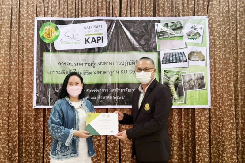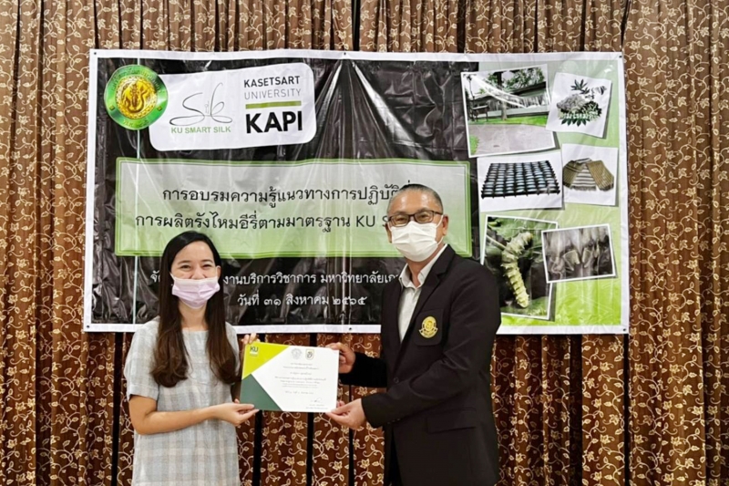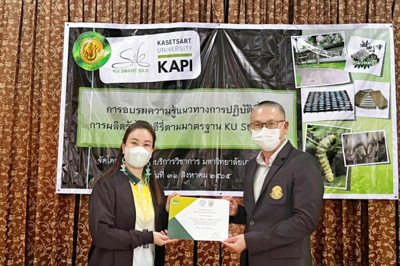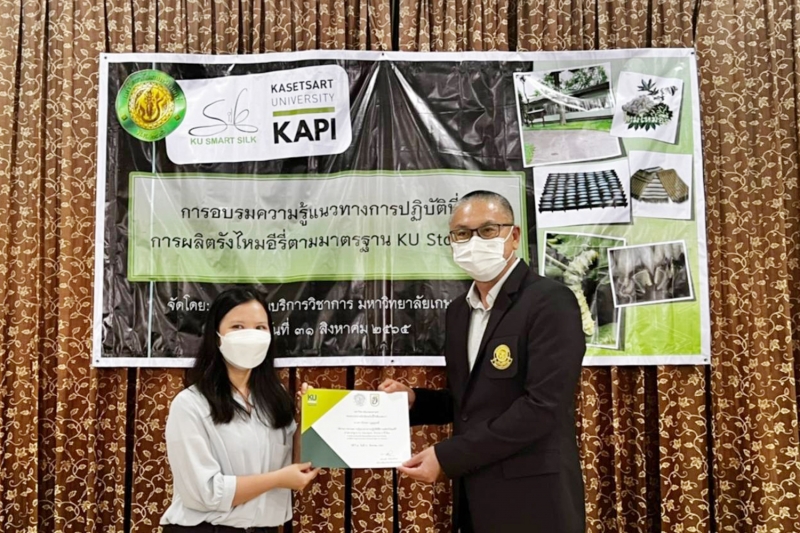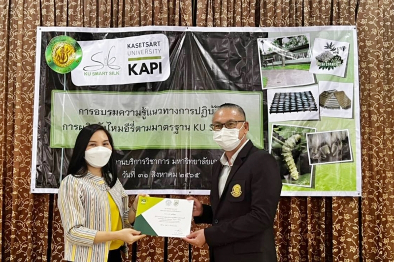 วันพุธที่ 31 สิงหาคม 2565 สำนักบริการวิชาการ มหาวิทยาลัยเกษตรศาสตร์ จัดการฝึกอบรม ความรู้แนวทางการปฏิบัติที่ดี การผลิตรังไหมอีรี่ ตามมาตรฐาน KU Standard โดยมี ผู้ช่วยศาสตราจารย์ ดร.อุไรวรรณ นิลเพ็ชร์ ที่ปรึกษา และ ผู้ช่วยศาสตราจารย์ ดร.รุ่งทิพย์ มาศเมธาทิพย์ ประธานกรรมการศูนย์ความเป็นเลิศทางวิชาการด้านไหม มหาวิทยาลัยเกษตรศาสตร์ เป็นวิทยากรอบรมภาคบรรยาย และ นางสาวศิริวรรณ ทุนคุ้มทอง เป็นวิทยากรภาคปฏิบัติ เพื่อให้ผู้เข้าอบรมเป็นผู้มีความรู้ความสามารถในการตรวจประเมินให้กับเกษตรกรผู้สนใจขอรับการรับรองมาตรฐาน KU Standard หมายเลข 001/2564 ข้อบังคับสำหรับกระบวนการผลิตรังไหมอีรี่ โดยได้รับเกียรติจาก รองศาสตราจารย์ น.สพ.ดร. อนุชัย ภิญโญภูมิมินทร์ รองอธิการบดีวิทยาเขตกำแพงแสน เป็นประธานเปิดโครงการ และ ผู้ช่วยศาสตราจารย์ ดร.ชัยสิทธิ์ ทองจู คณบดีคณะเกษตร กำแพงแสน กล่าวต้อนรับ ณ ห้องอเนกประสงค์ คณะเกษตร กำแพงแสน