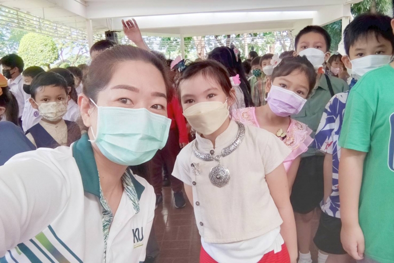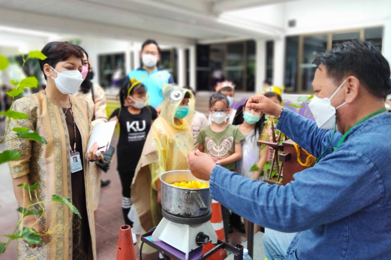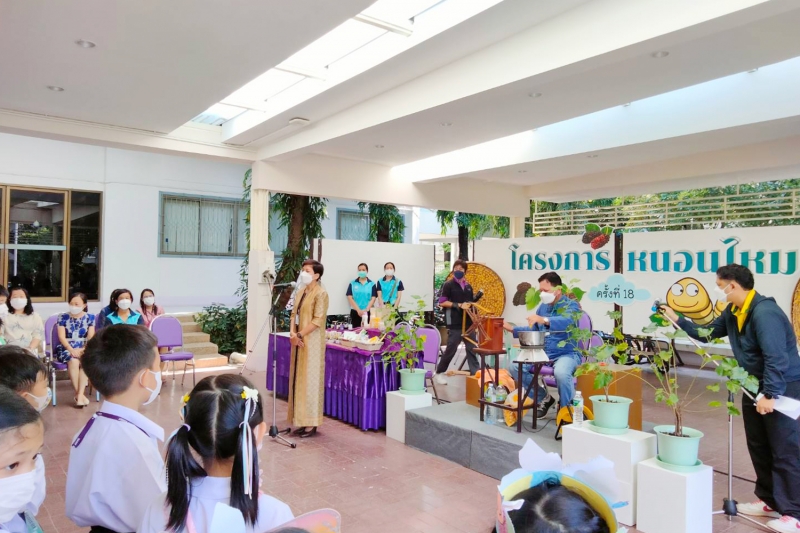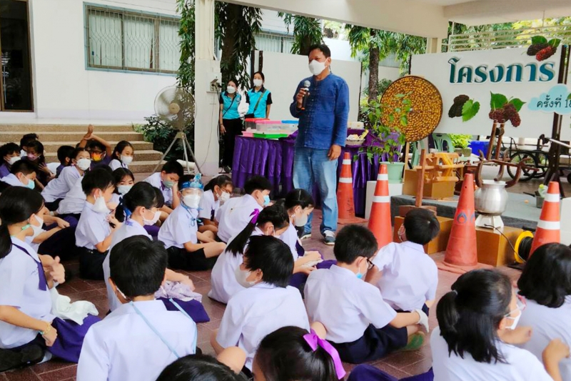 วันศุกร์ที่ 2 กันยายน 2565 ผู้ช่วยศาสตราจารย์ ดร.รุ่งทิพย์ มาศเมธาทิพย์ หัวหน้าภาควิชากีฏวิทยา และนายแผด สตารัตน์ บุคลากรภาควิชากีฏวิทยา คณะเกษตร กำแพงแสน และกรรมการศูนย์ความเป็นเลิศทางวิชาการด้านไหม มหาวิทยาลัยเกษตรศาสตร์ ได้รับเชิญเป็นวิทยากรบรรยายและสาธิตการสาวไหม ใน โครงการหนอนไหม ครั้งที่ 18 สำหรับนักเรียนประถมศึกษาปีที่ 3 จำนวน 7 ห้อง 280 คน และ ประถมศึกษาปีที่ 5 จำนวน 6 ห้อง 240 คน จัดโดยชมรมรักโรงเรียน ณ โรงเรียนสาธิตแห่งมหาวิทยาลัยเกษตรศาสตร์ ศูนย์วิจัยและพัฒนาการศึกษา บางเขน